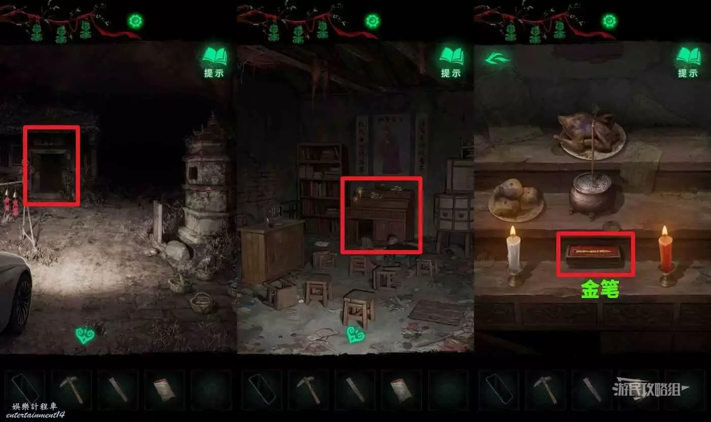 紙嫁衣 8 第二章學堂供台謎題解法 5 7 月 2025-07-05 廣告 作者:瑞破受氣包 來源:遊民星空 第二章學堂供台謎題解法 在奘鈴村村口二樓房間打開綠盒子獲得供台線索,返回車旁邊的學堂,點擊中間的供台,按照帳本上的線索佈置供台,獲得【金筆】。供台佈置如下: 空雞空 饅香空 白空紅