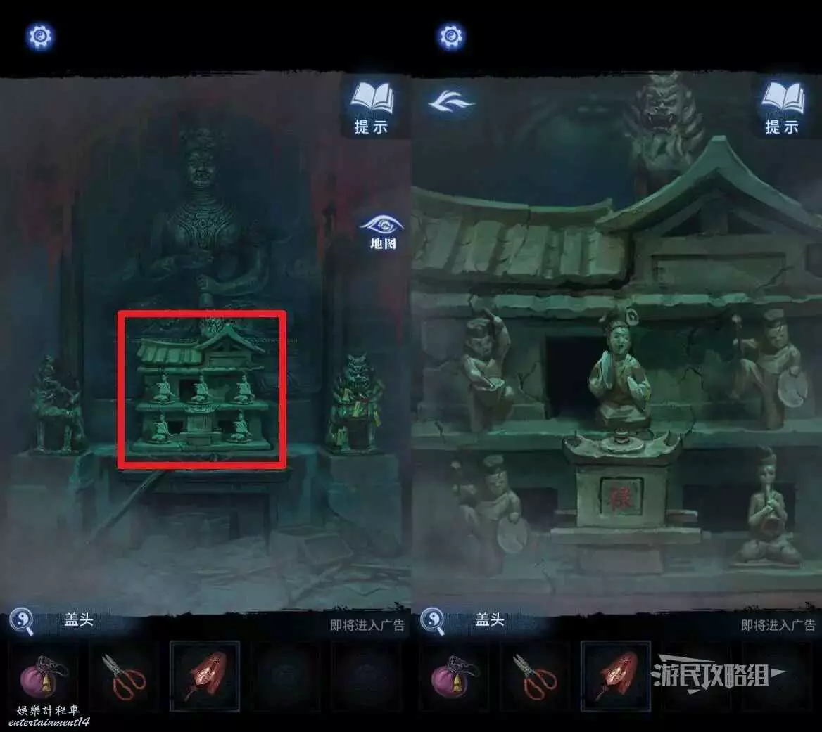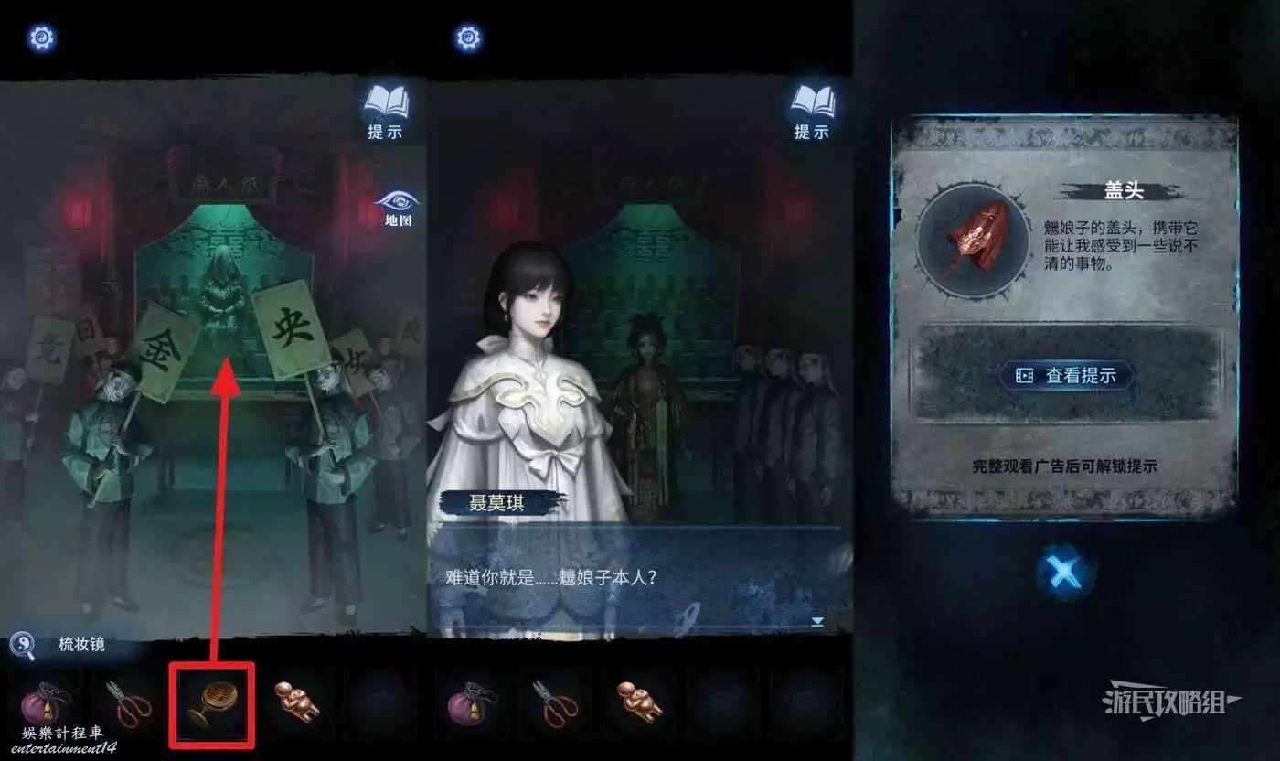 完成六禮軒蠟燭點燈謎題後,點擊介面右側【地圖】前往【紙人廟】,在道具欄選擇【梳妝鏡】放在雕像下方,觸發劇情,獲得【蓋頭】。
