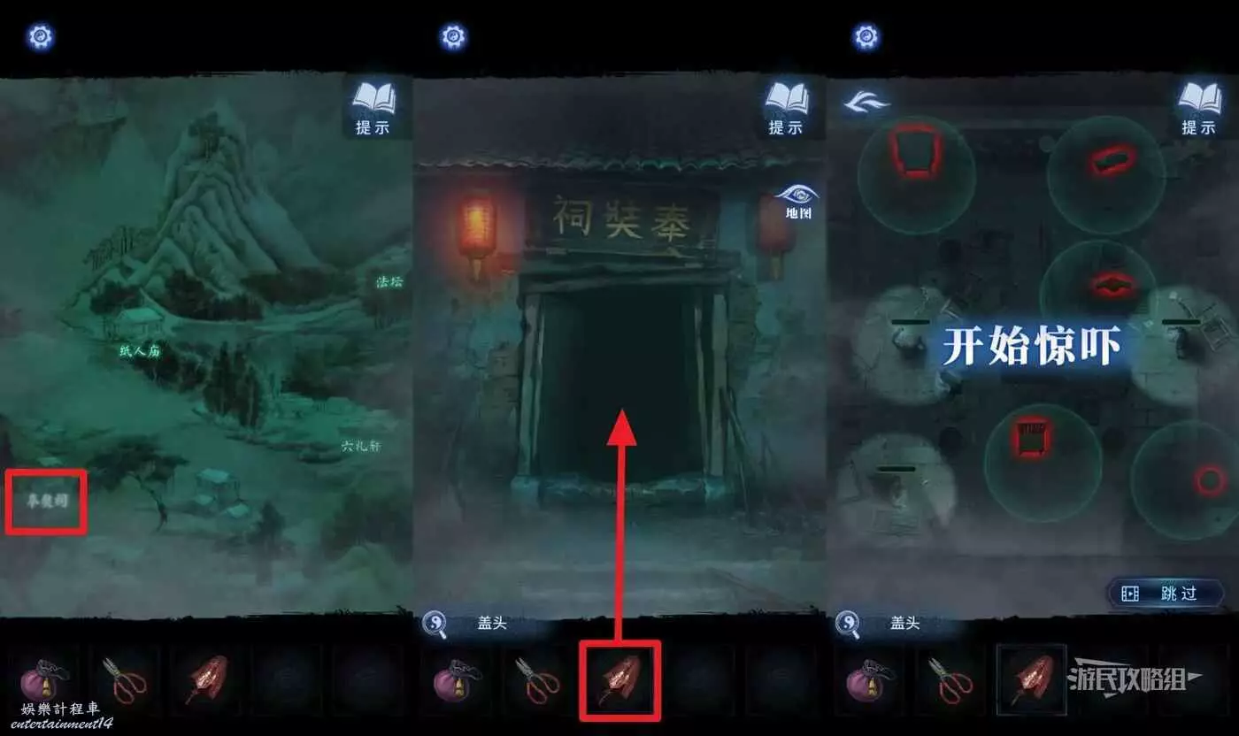 再次點擊【地圖】,來到【奉奘祠】,選擇道具欄中的【蓋頭】進門,觸發一個嚇人小遊戲,需要同時將三個人的驚嚇值全部拉滿才能完成小遊戲,如果嫌麻煩可以直接跳過。