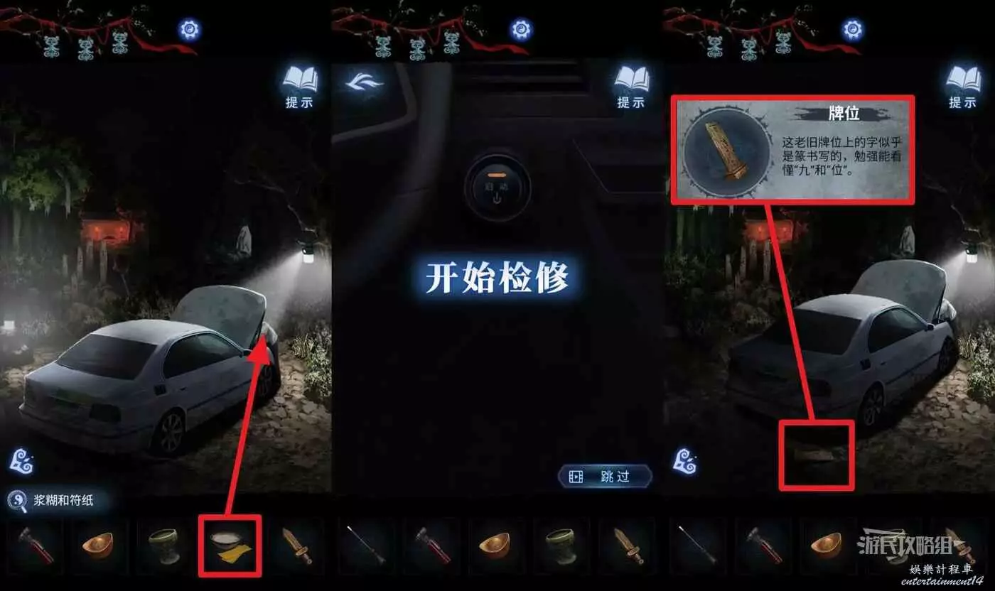 解開棄煞牢櫃子謎題獲得【漿糊和符紙】後,返回車邊,選擇【漿糊和符紙】交給寧子服。開啟修車小遊戲,需要在下方指標進入藍色區域時按下按鈕,如果嫌麻煩可以直接跳過。完成檢修後觸發劇情,看完劇情,可以在車後輪下方拾取【牌位】。