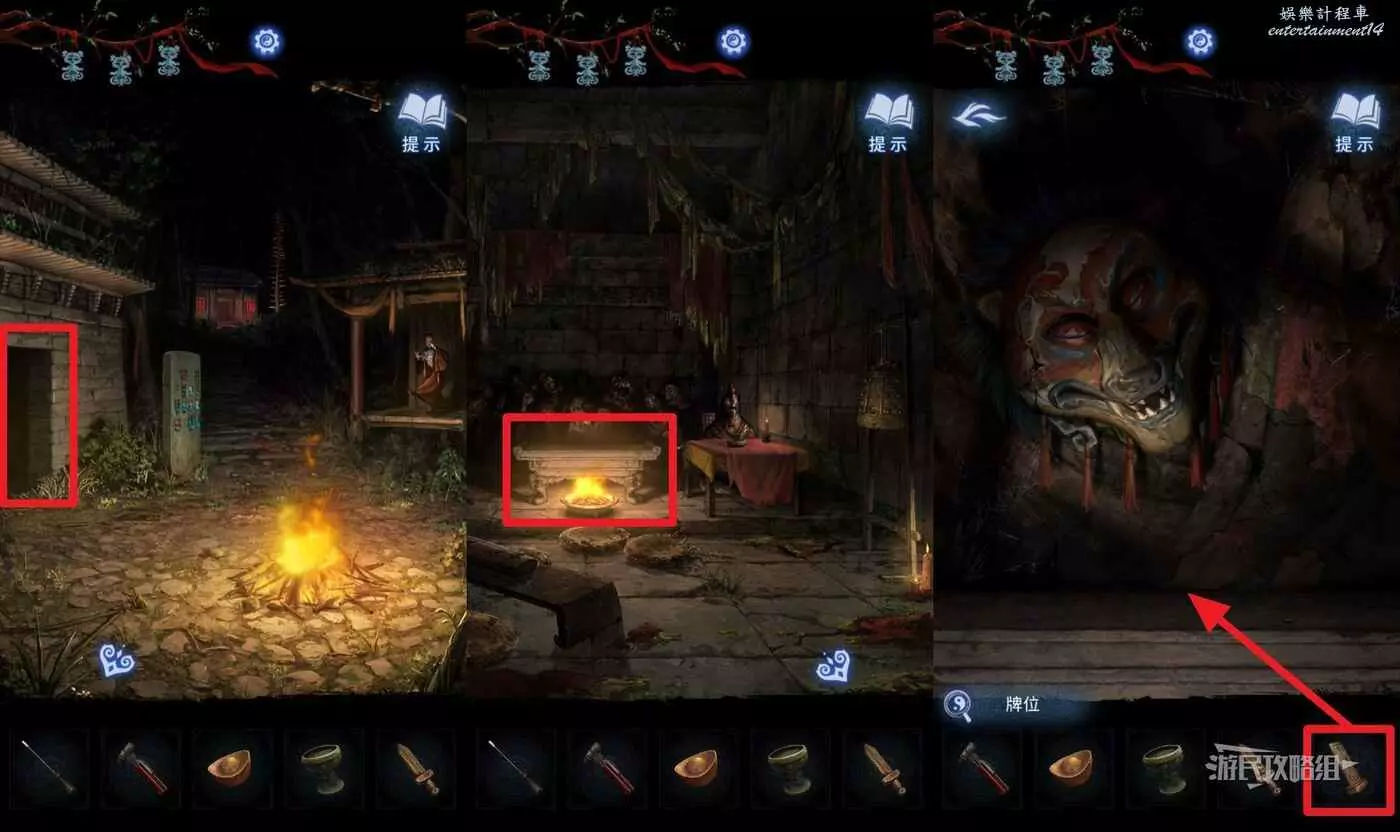 返回篝火所在區域,點擊右側牆上的門進入房間,點擊房間中間的供桌,在道具欄選擇【牌位】放上供桌(有音效小高能)。