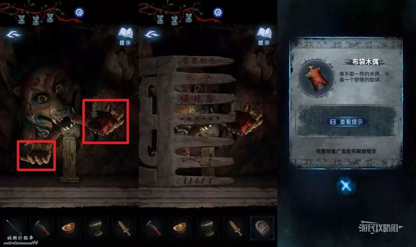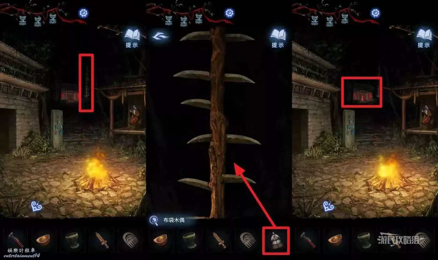 前往篝火所在區域,點擊樓梯上方帶尖刺的棍子,在道具欄選擇【布袋木偶】放在棍子上,即可打開亮紅燈房間的門。