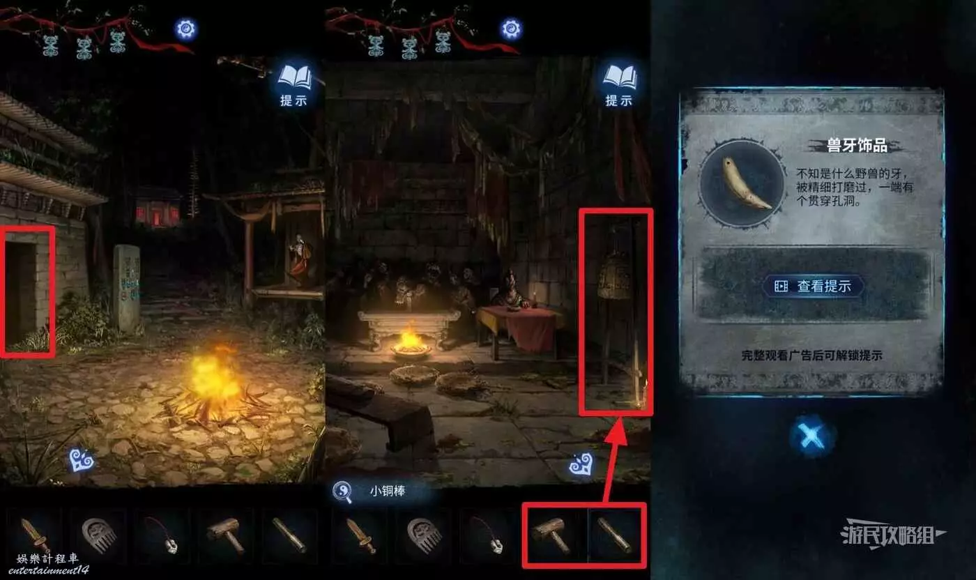 紙嫁衣 8 第四章敲鐘謎題解法 5 7 月 2025-07-05 廣告 作者:瑞破受氣包 來源:遊民星空 第四章敲鐘謎題線索 前往紅燈房,點擊畫面右側的壁畫,在道具欄選擇之前通過鐵枝木偶戲獲得的工具【梳子】,獲得新的線索,這裡是根據梳子上的圖案的數位來標註右側銅棒或錘的順序。 第四章敲鐘謎題解法 離開房間回到篝火區域,進入左側的房間,在道具欄選擇【小木錘】或【小銅棒】(完成杖頭木偶戲獲得)按照正確的順序敲擊右側的鐘,獲得【獸牙飾品】。 正確順序為:棒-棒-錘-棒-錘-錘-棒。
