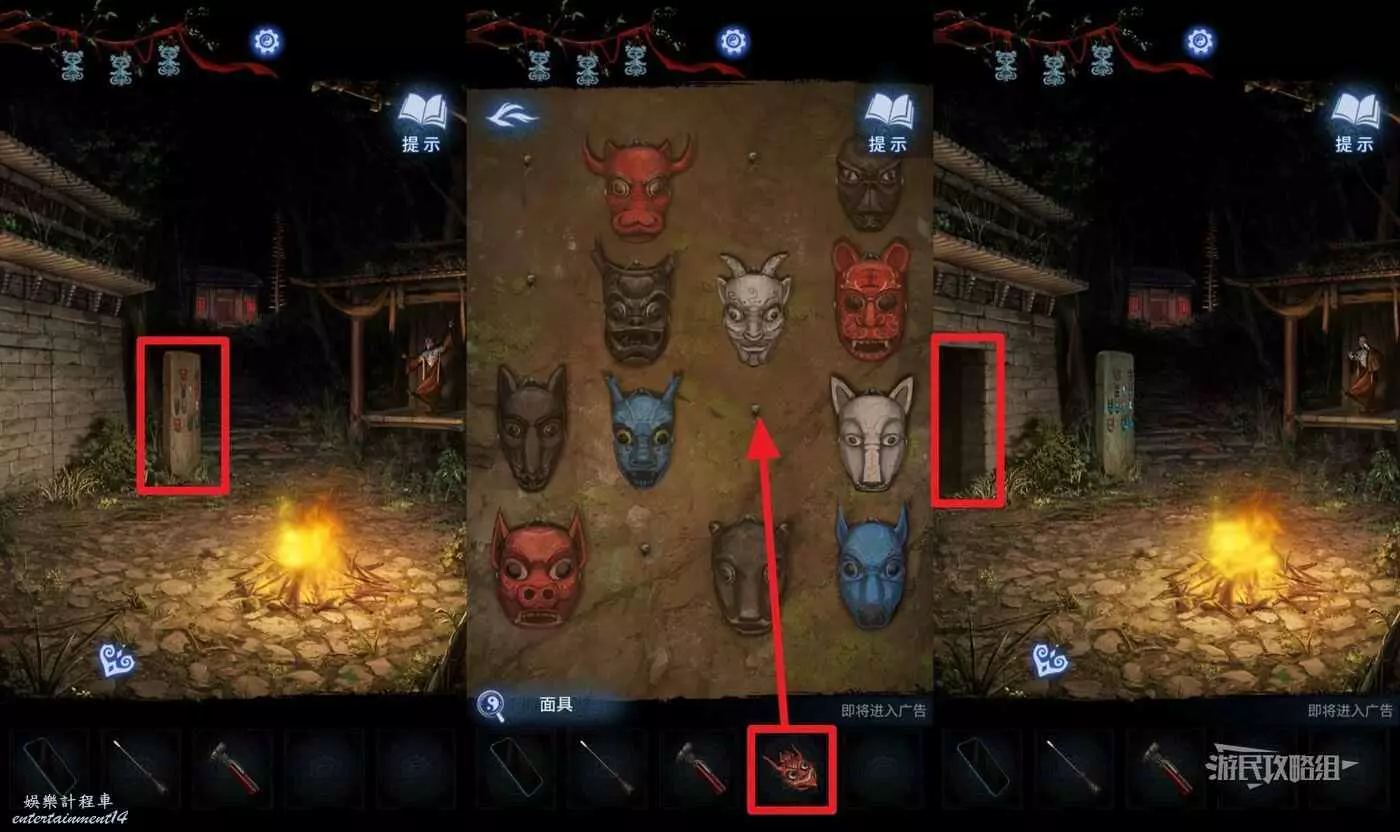 回到篝火區域,點擊左側掛著面具的石碑,在道具欄選擇【面具】把它掛在石碑上,開啟左側建築大門(注意有音效小高能)。