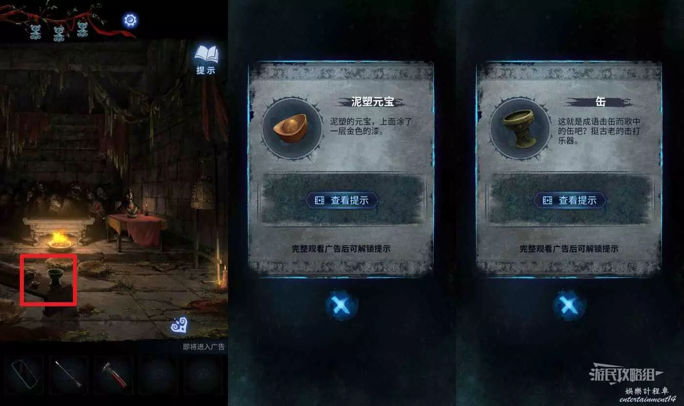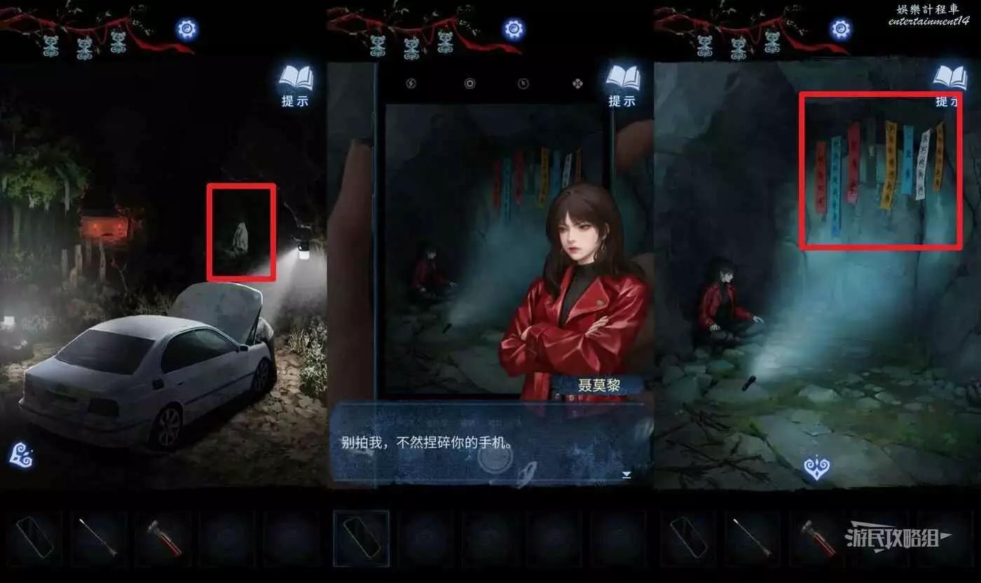 看完劇情後進入第四章,此時點擊右側【山洞】,記住右上方的布條顏色和圖案數量,這是古琴謎題的線索。