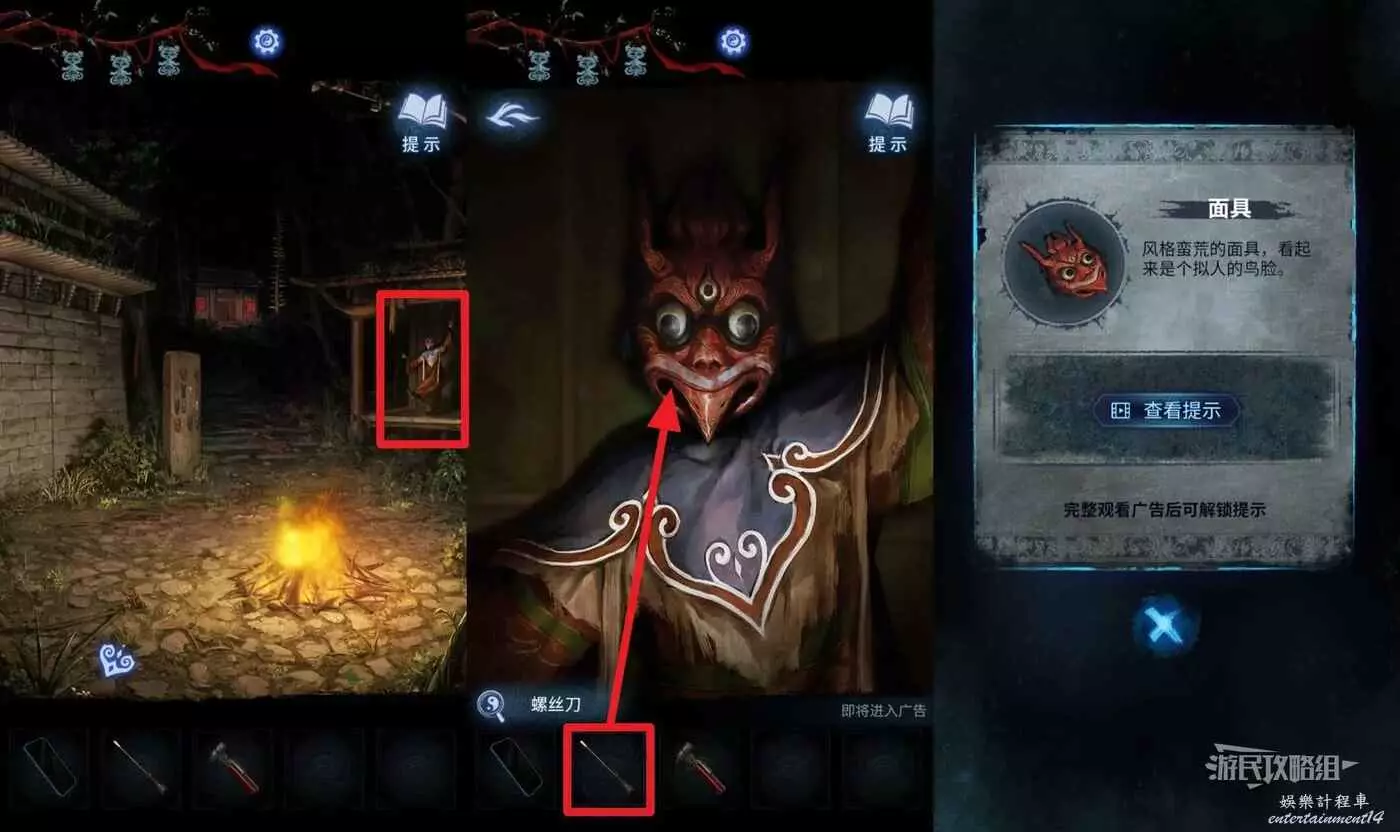 點擊車旁邊的箭頭前往篝火所在區域,點擊右側舞台上的木偶,在道具欄選擇【螺絲刀】再點擊木偶(注意有小高能),獲得【面具】。