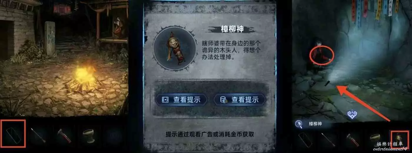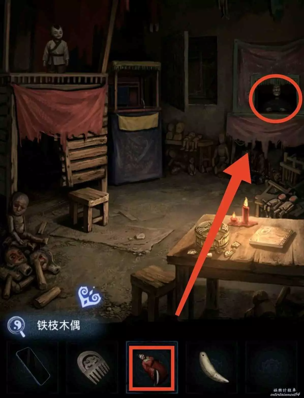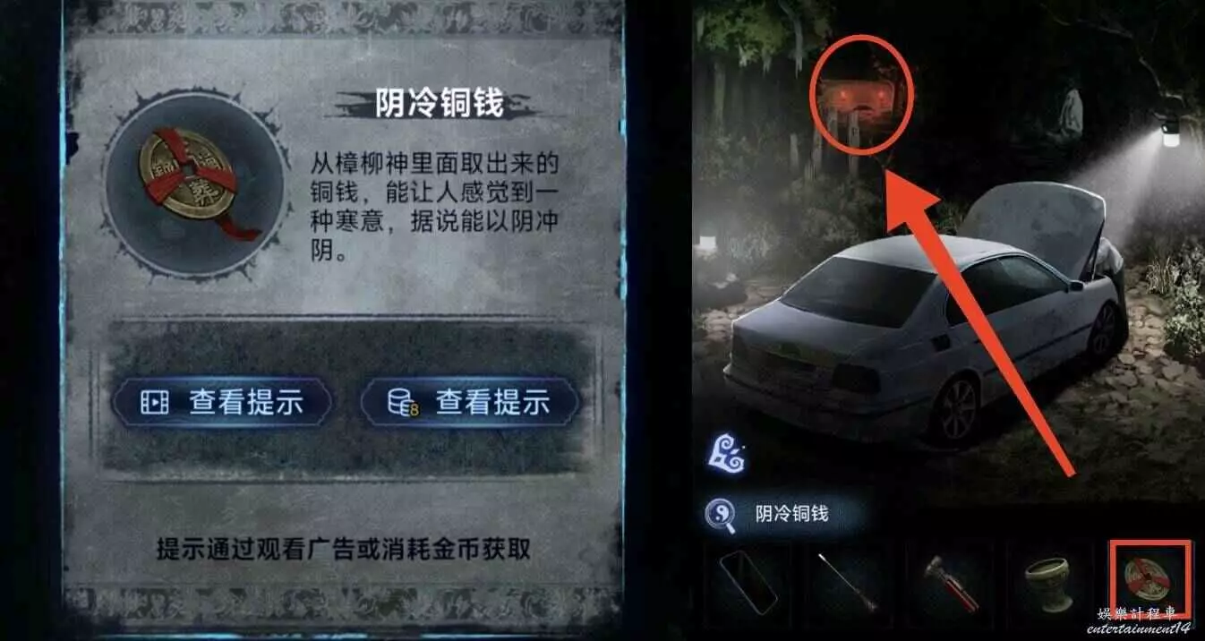 3、元寶放在雞的桌子上,隨便選一邊結果一樣的,獲得線索3(沒這麼快用上),出門遇到樟柳神,用手機輔助可以抓住它,比較簡單不多贅述,把它交給莫黎,獲得陰冷銅錢,用銅錢去第一個場景紅色房間。