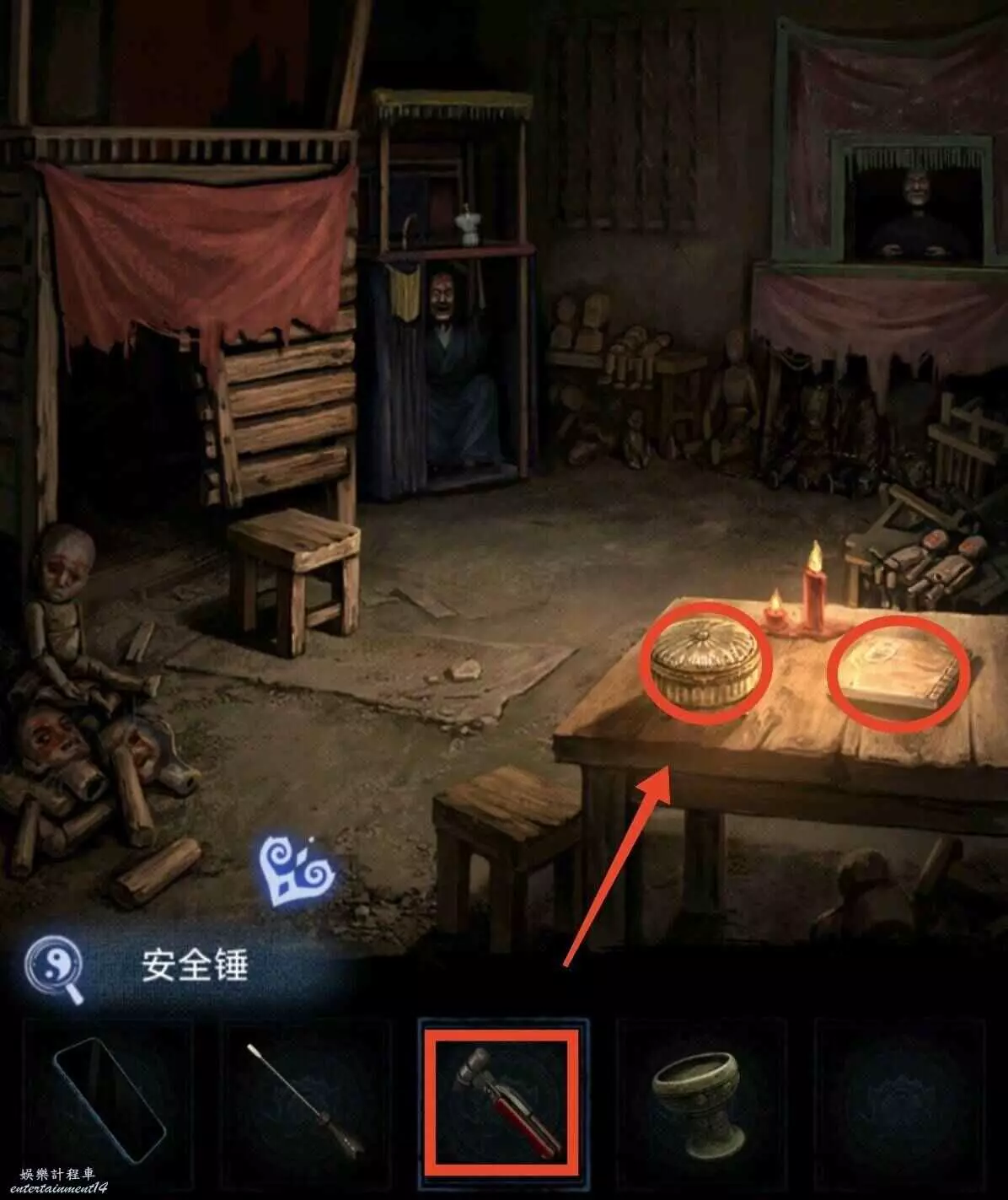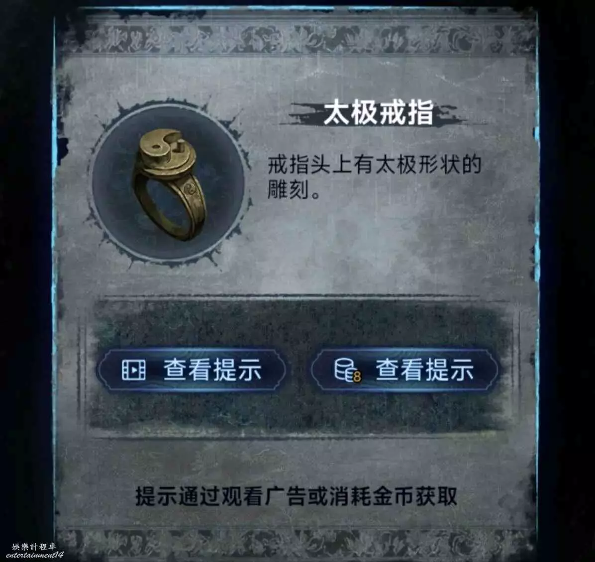 4、用錘子砸開盒子,獲得太極戒指,翻開旁邊的冊子,獲得線索4,把線索2和線索4結合,得到謎底如下圖4,獲得膠帶和桃木劍。