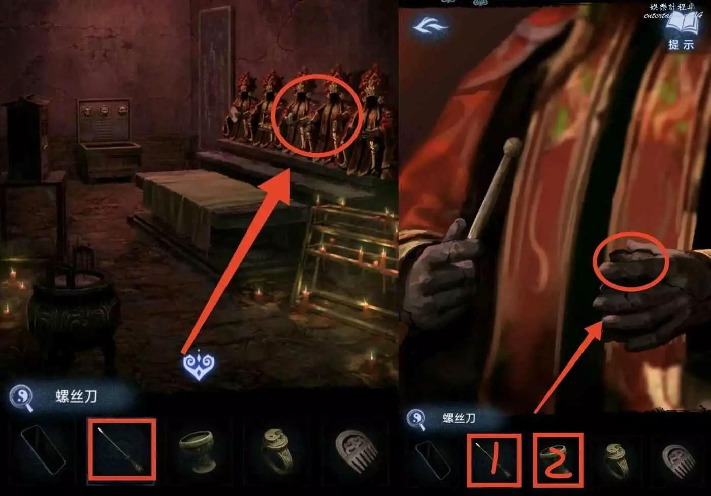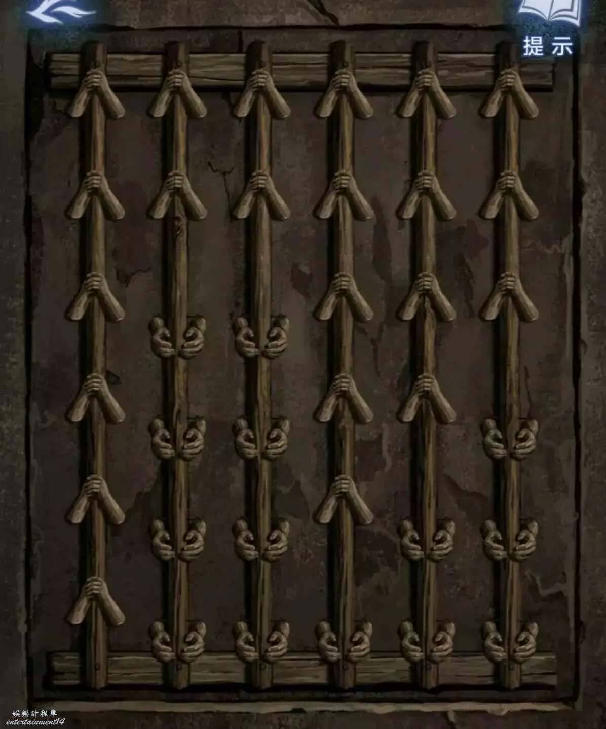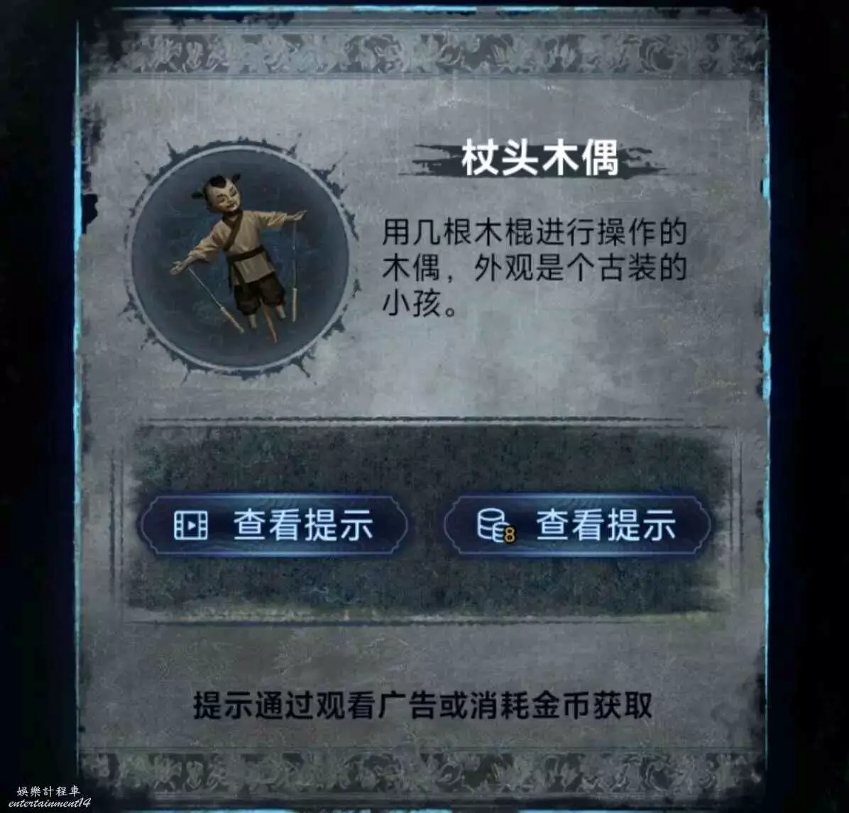 7、進門先看雕像,用螺絲刀把雕像手裡爛掉的缶撬下來,換上新的缶,獲得杖頭木偶。在旁邊石壁畫上,用解謎卡記住順序:棒棒錘棒錘錘棒