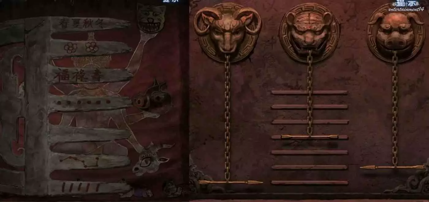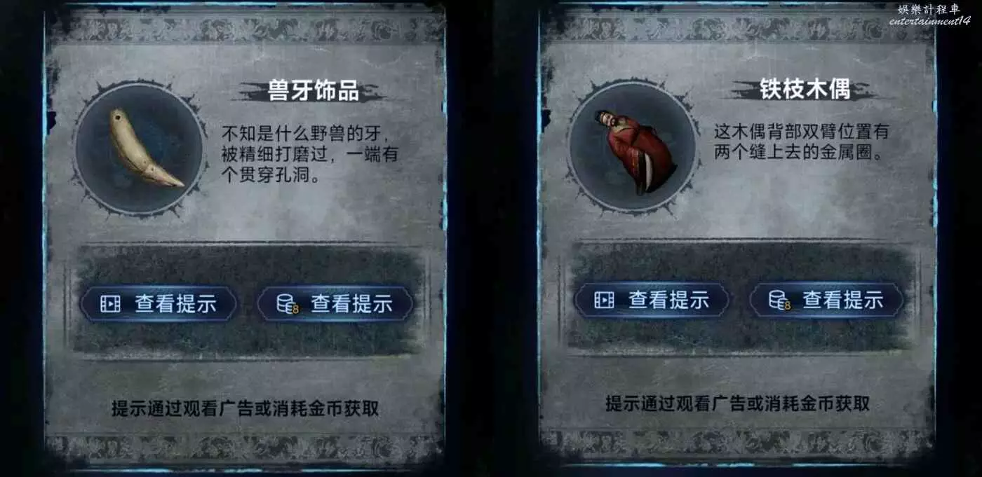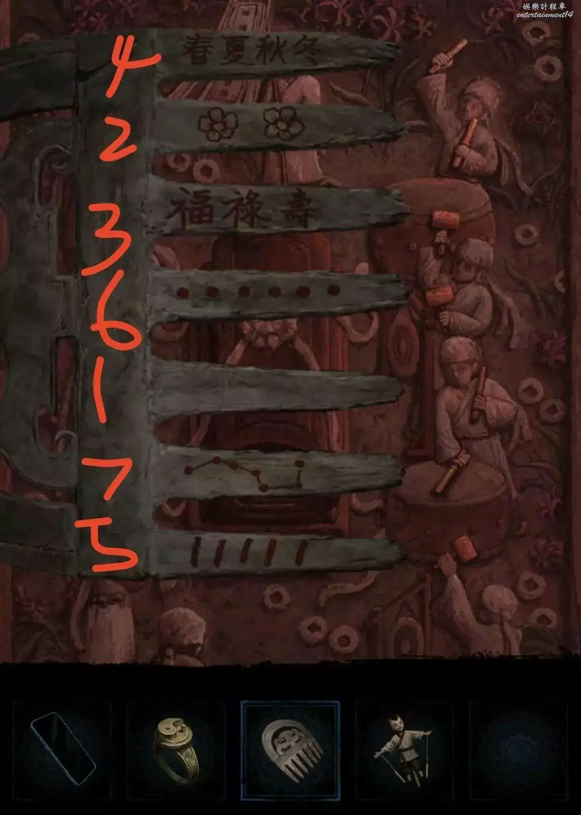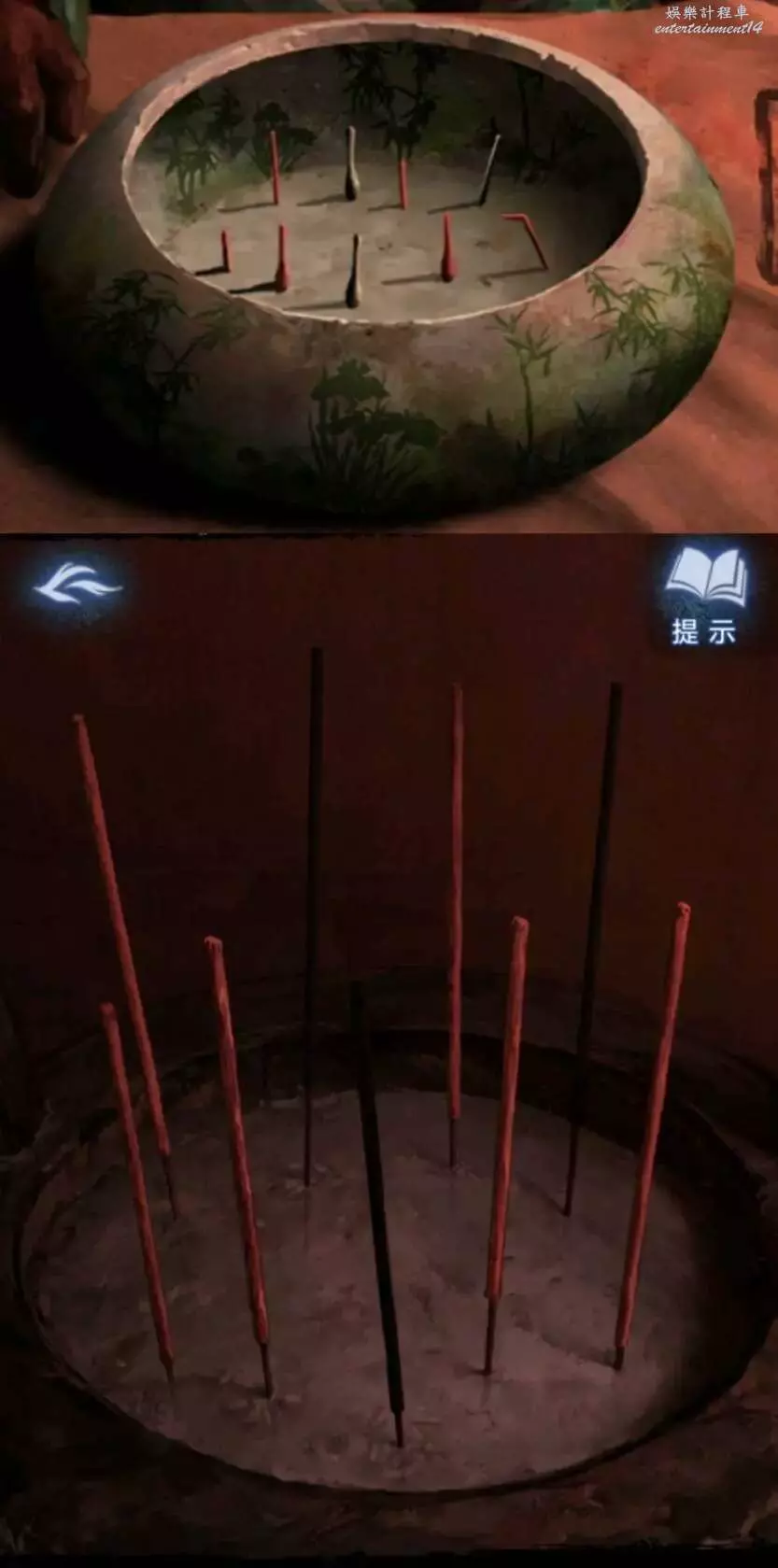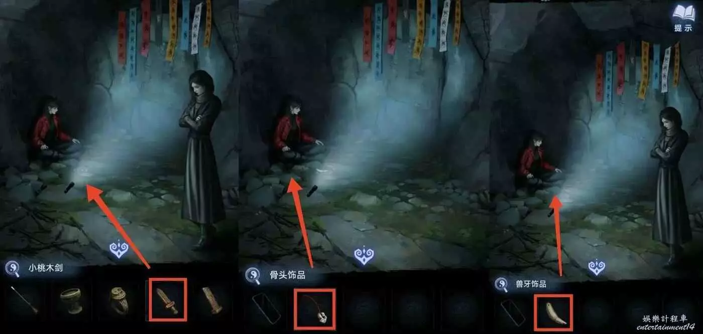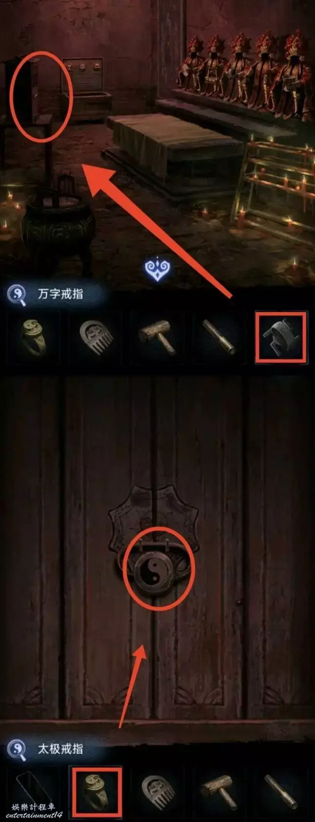 8、萬字戒指放小櫃子開鎖,太極戒指開第二層,獲得鐵汁木偶和獸牙飾品,旁邊的香爐根據線索3的顏色弄好就行,獲得骨頭飾品。