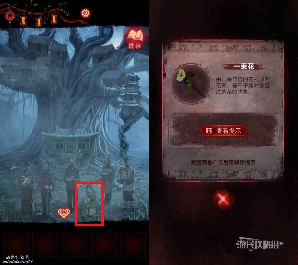 【聶莫黎視角】回到樹幹區域,點擊畫面中間的銅錢,在道具欄選擇【一束花】放在銅錢中,解鎖轉盤,在轉盤下方拾取【古怪樹枝】。