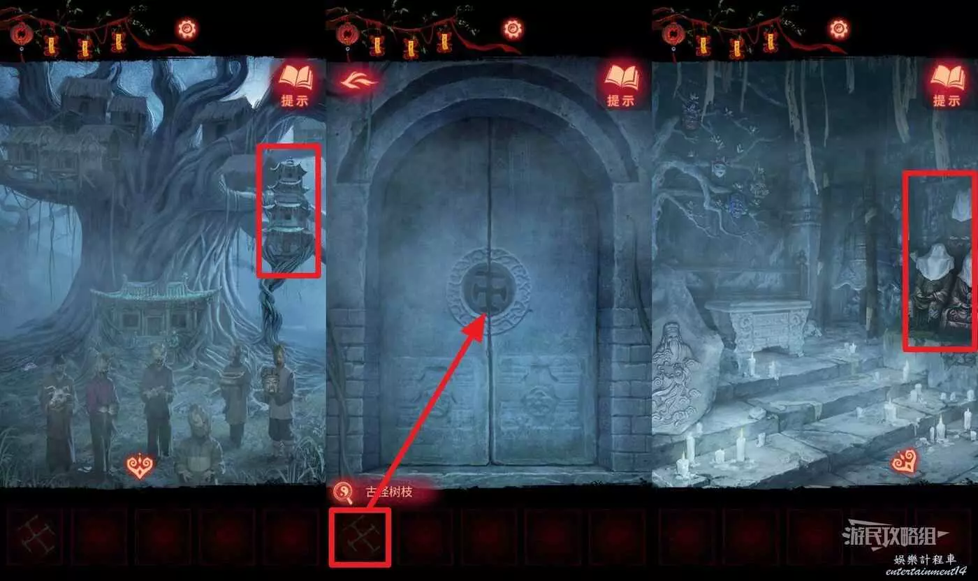 【聶莫黎視角】回到樹根區域,點擊畫面右上方的塔,在道具欄選擇【古怪樹枝】放在門上,解鎖塔門,進塔之後點擊畫面右側的雕像,可以獲得無頭雕像的線索。