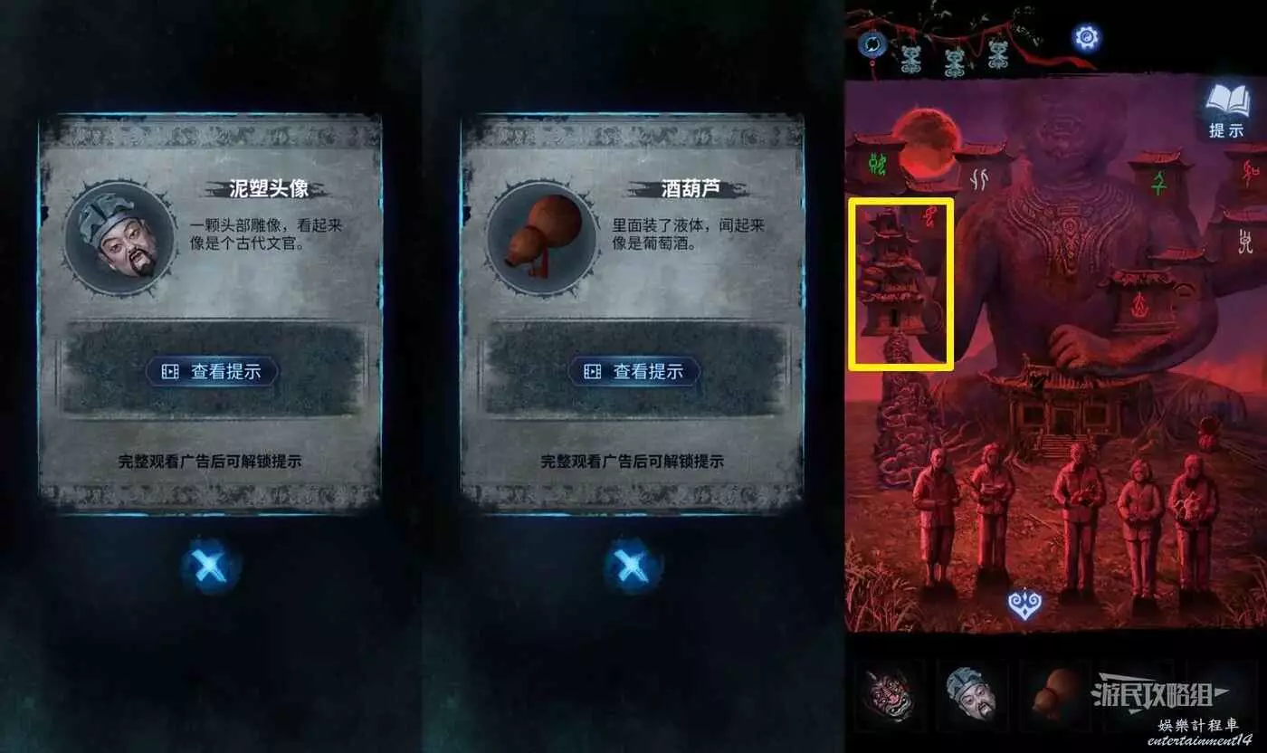 【聶莫琪視角】切換到聶莫琪視角,前往六葬雕像區域觸發劇情,獲得第二個【泥塑頭像】和【酒葫蘆】。此時畫面左側的塔門已經開了,進入塔門。第一個【泥塑頭像】是進入第五章時解開點亮燈籠謎題獲得的。