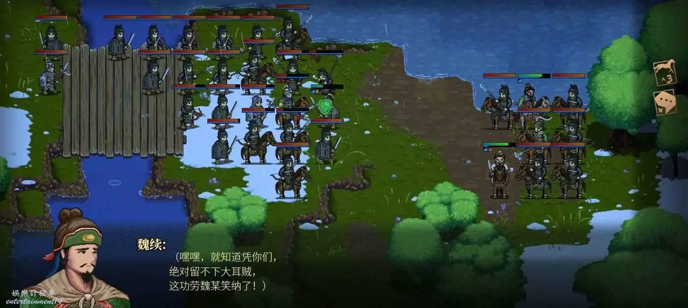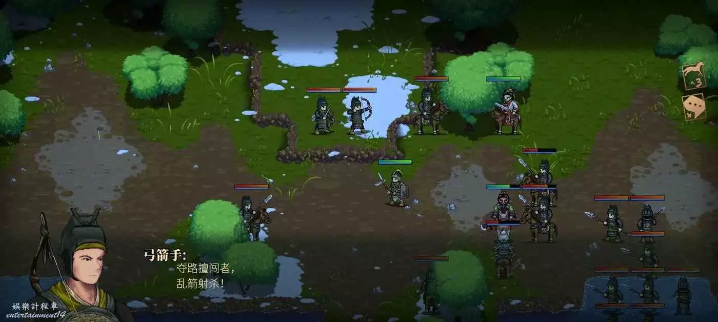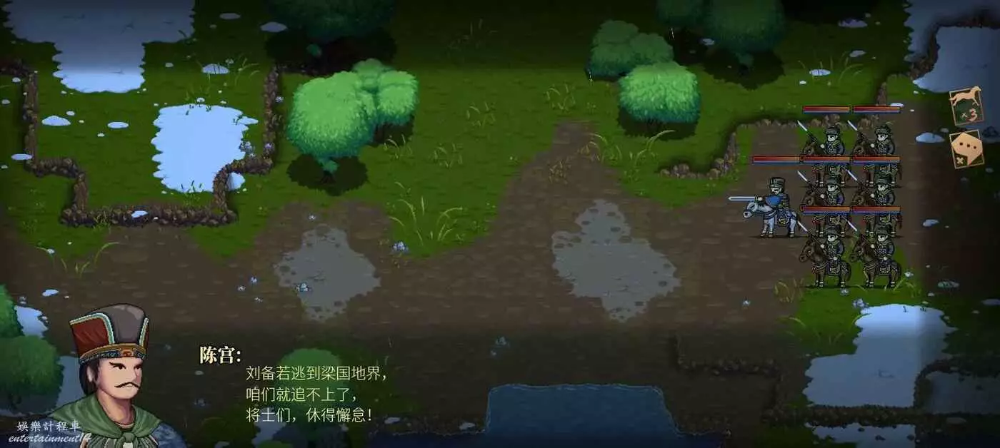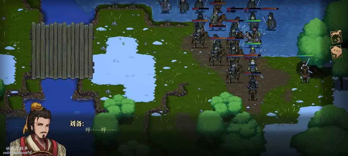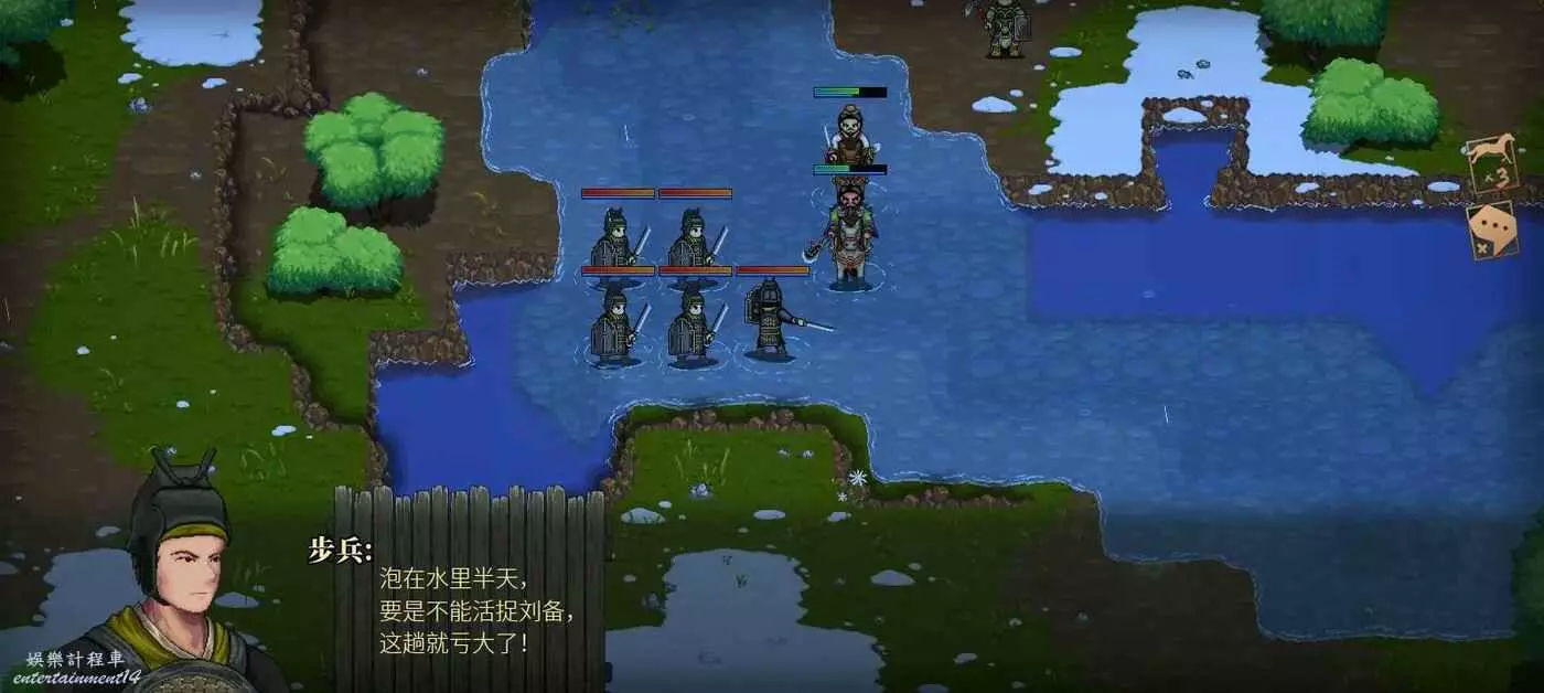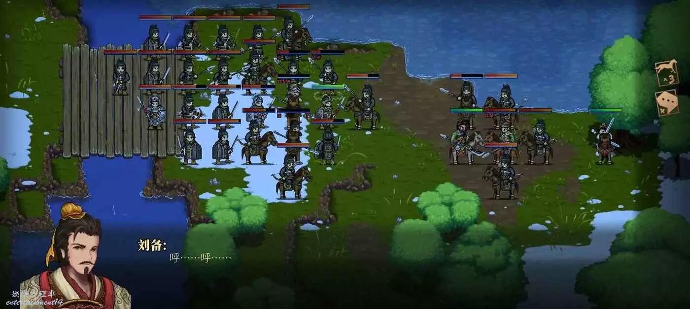 當劉備部隊靠近中間淺灘,淺灘中會有伏兵(盾步兵5個)進攻劉備部隊,提前擺好隊形