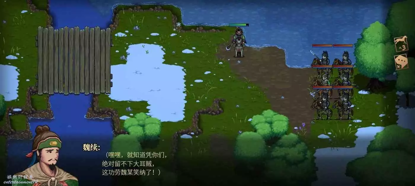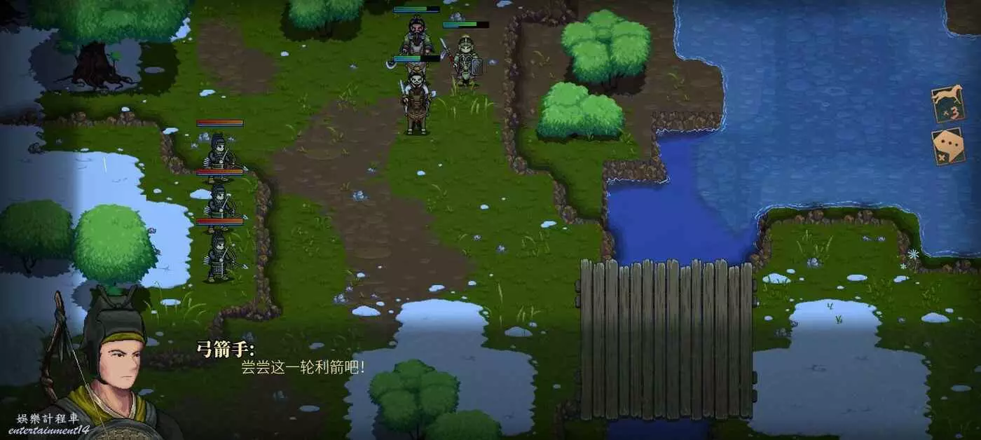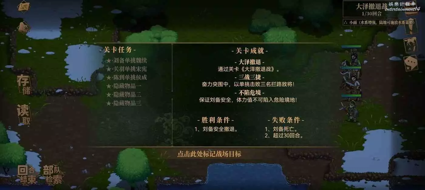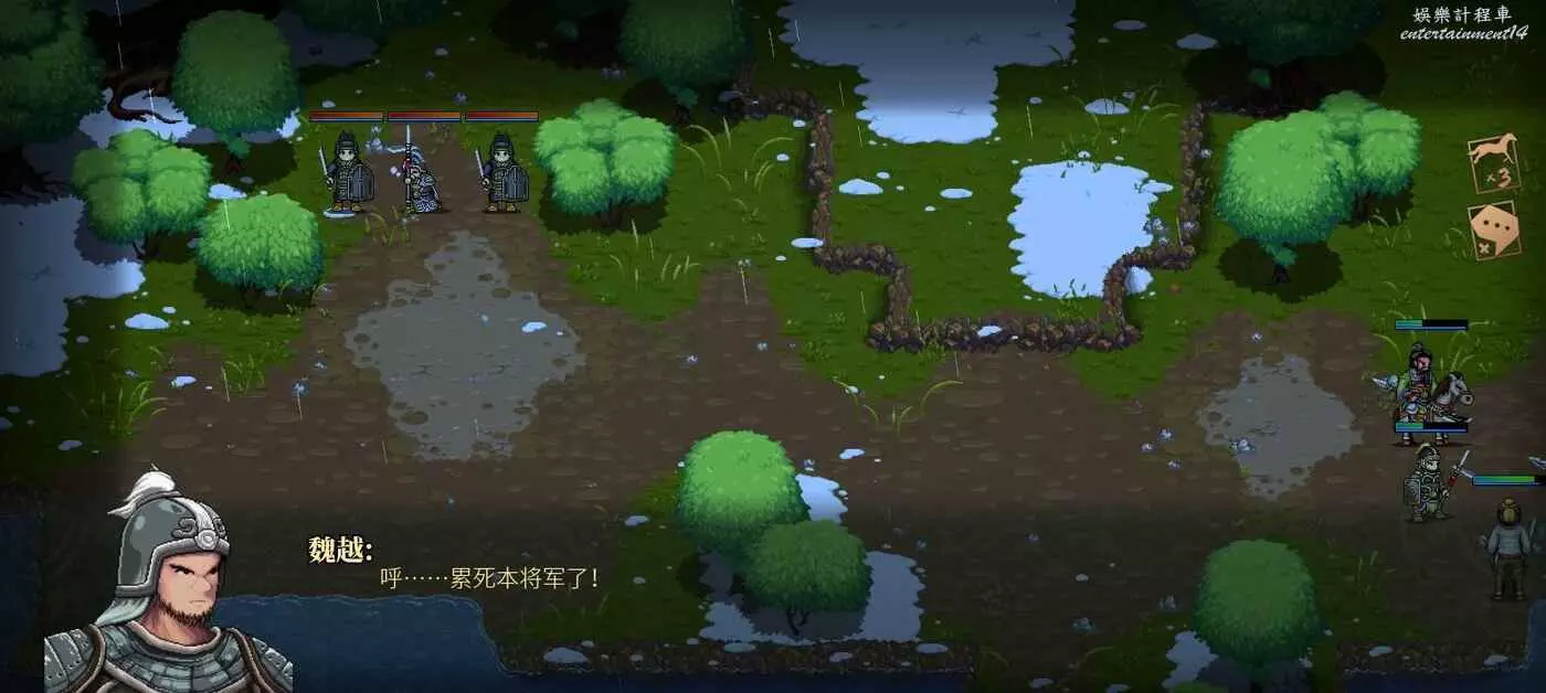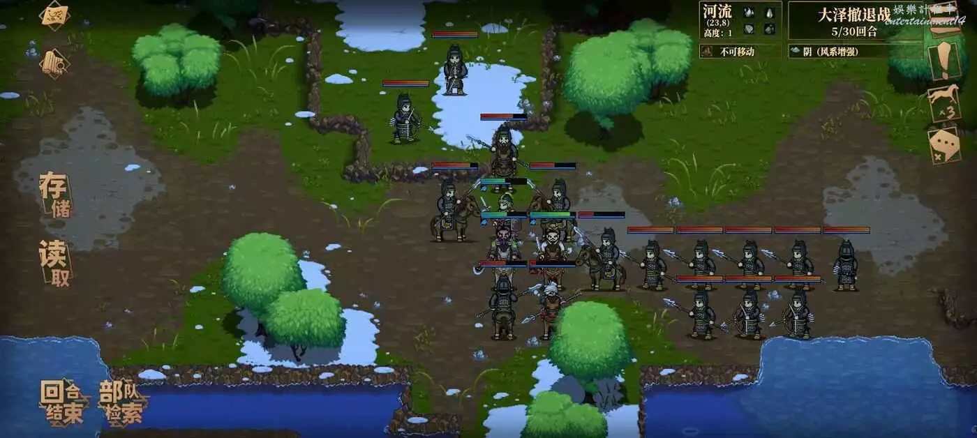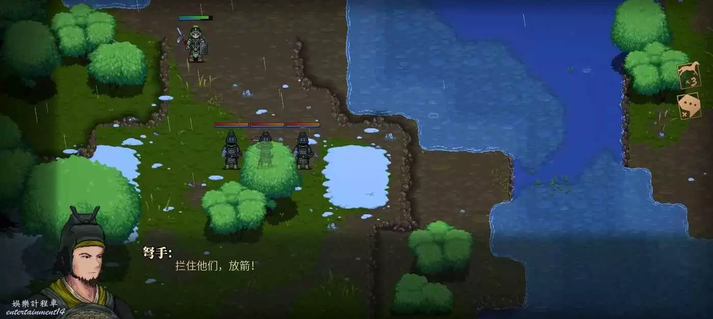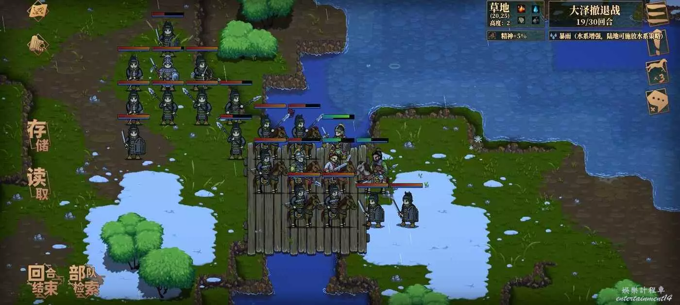 當劉備部隊靠近中間淺灘,淺灘中會有伏兵(盾步兵5個)進攻劉備部隊,提前擺好隊形