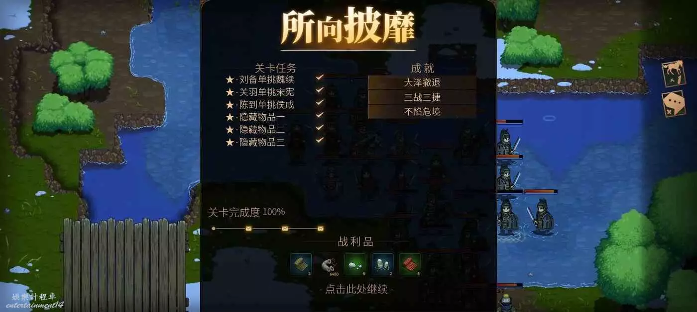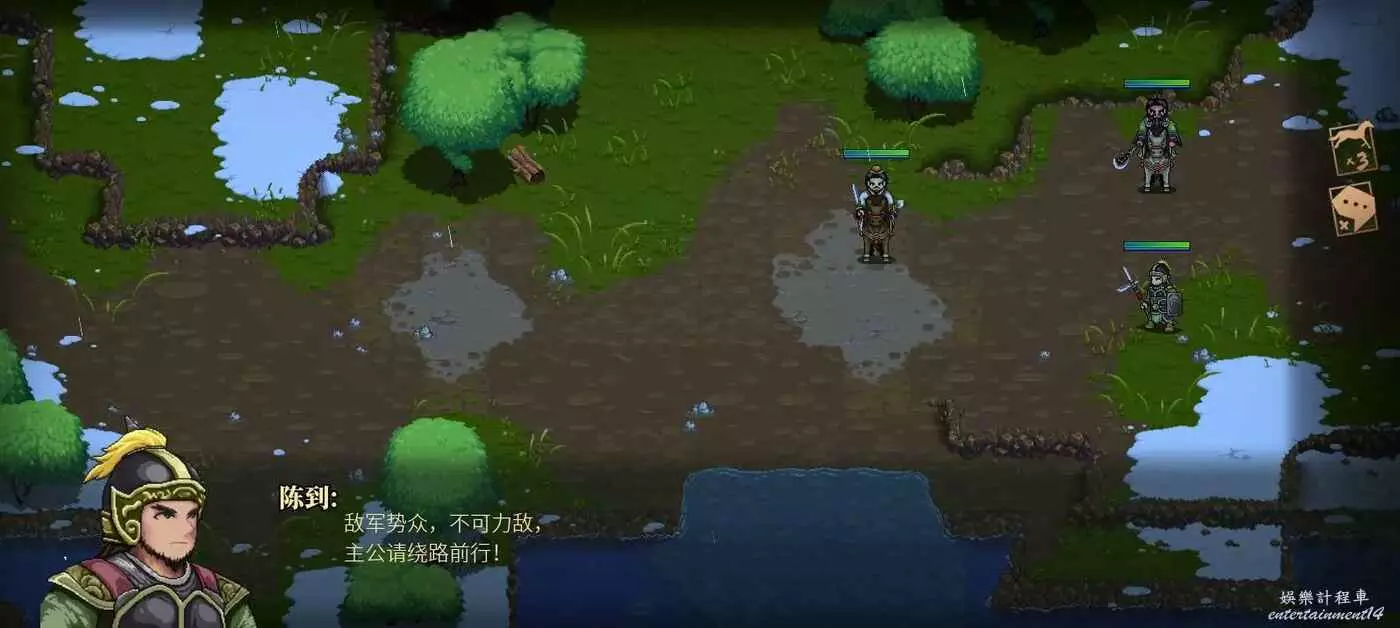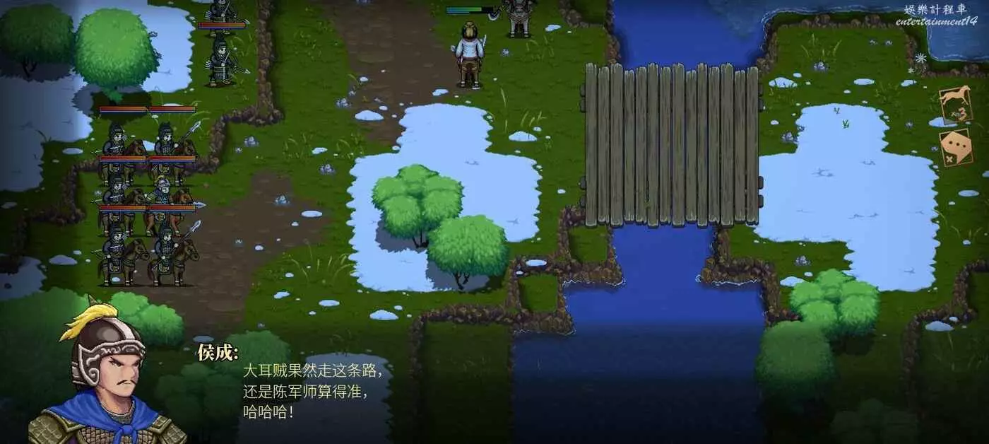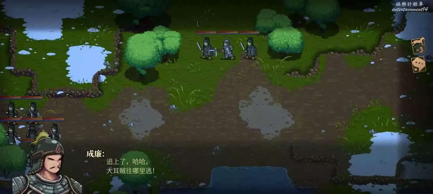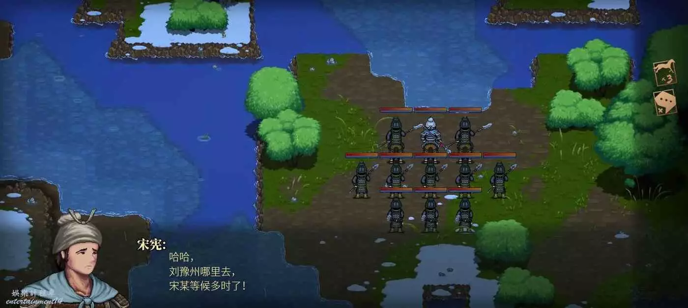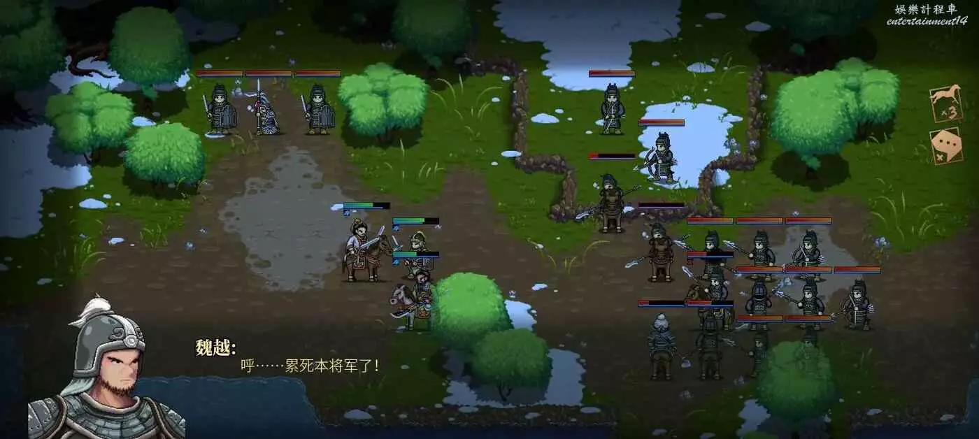 當劉備部隊靠近中間淺灘,淺灘中會有伏兵(盾步兵5個)進攻劉備部隊,提前擺好隊形