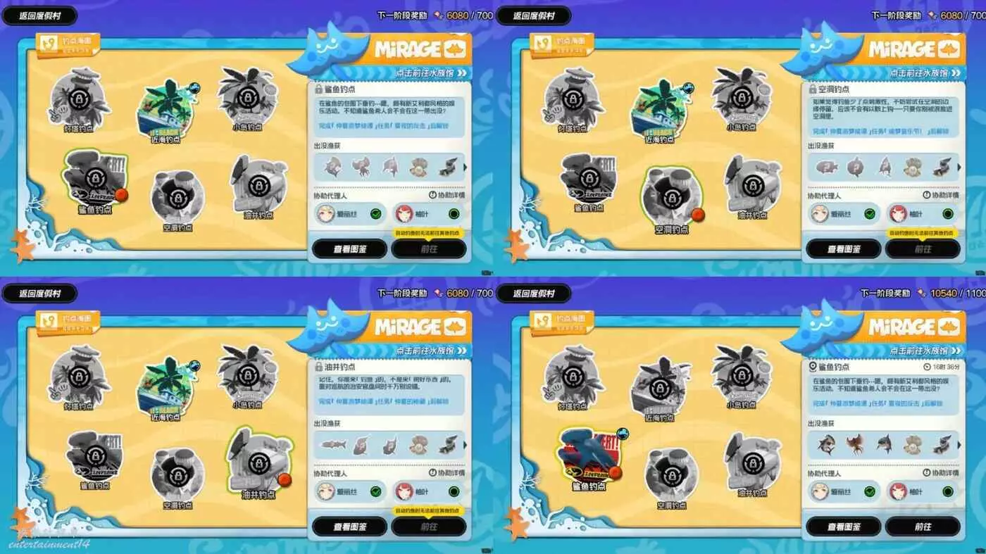 釣魚玩法,共有6個釣點,其中鯊魚,空洞,油井釣點需要後續階段解鎖。