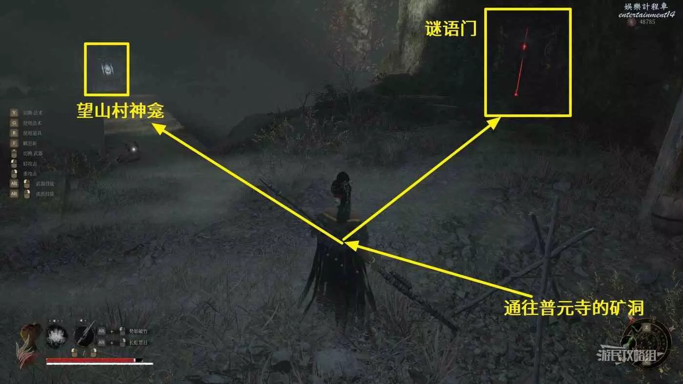 打完佛源鎮唐王行宮內的BOSS“指揮使”紅嵐後,自動返回普元寺,使用【普元寺鑰匙】打開普元寺院內廣場上的側門,沿著唯一的路穿過礦洞前往望山村,這個謎題門就在礦洞出口旁邊,橋對面是【雲頂城-望山村】的神龕。