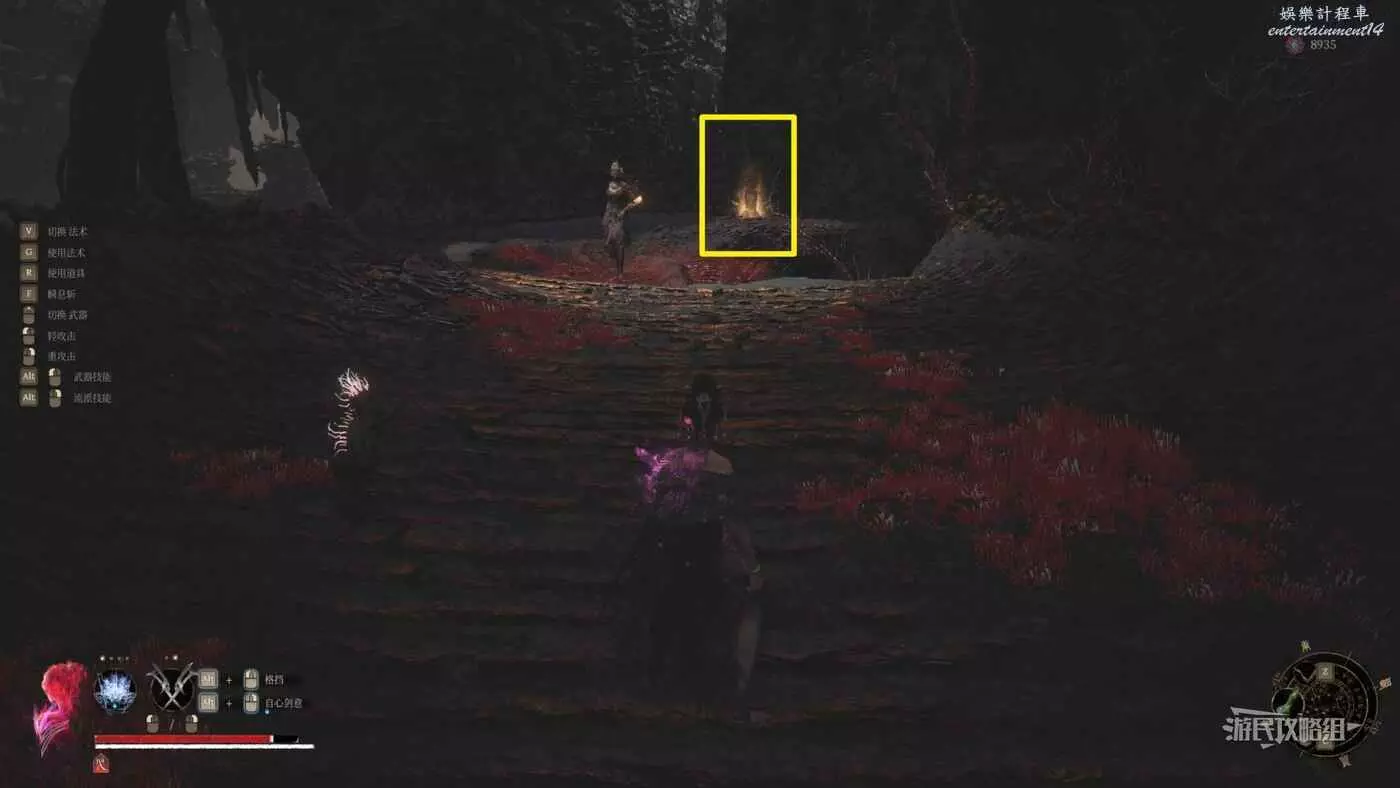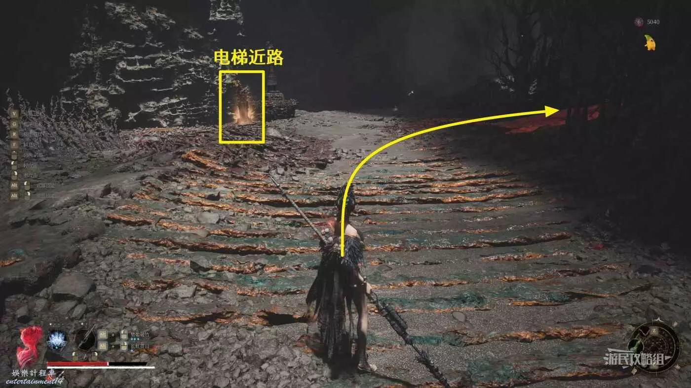 沿著紅色的路往右走到頭可以看到一個啞巴侍女,侍女旁邊有一個電梯機關,坐電梯往下走。注意坐電梯期間會遇到幾個遠端小怪,如果此時已經打完了巫祝,也可以先上個巫祝的盾再坐電梯。