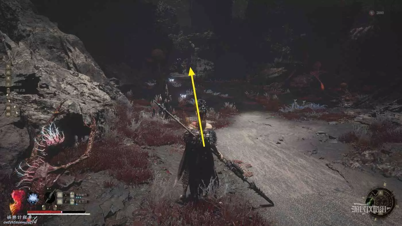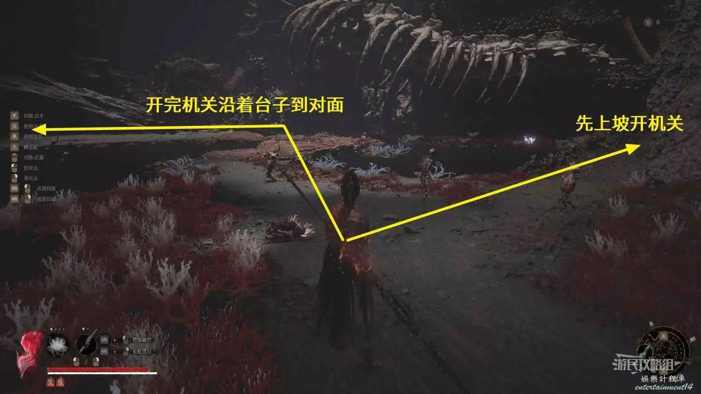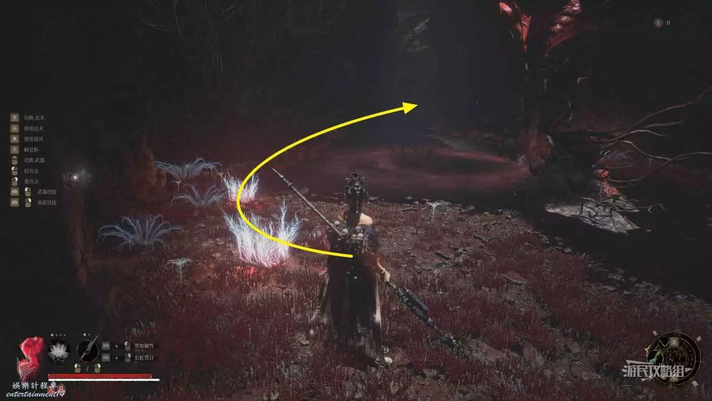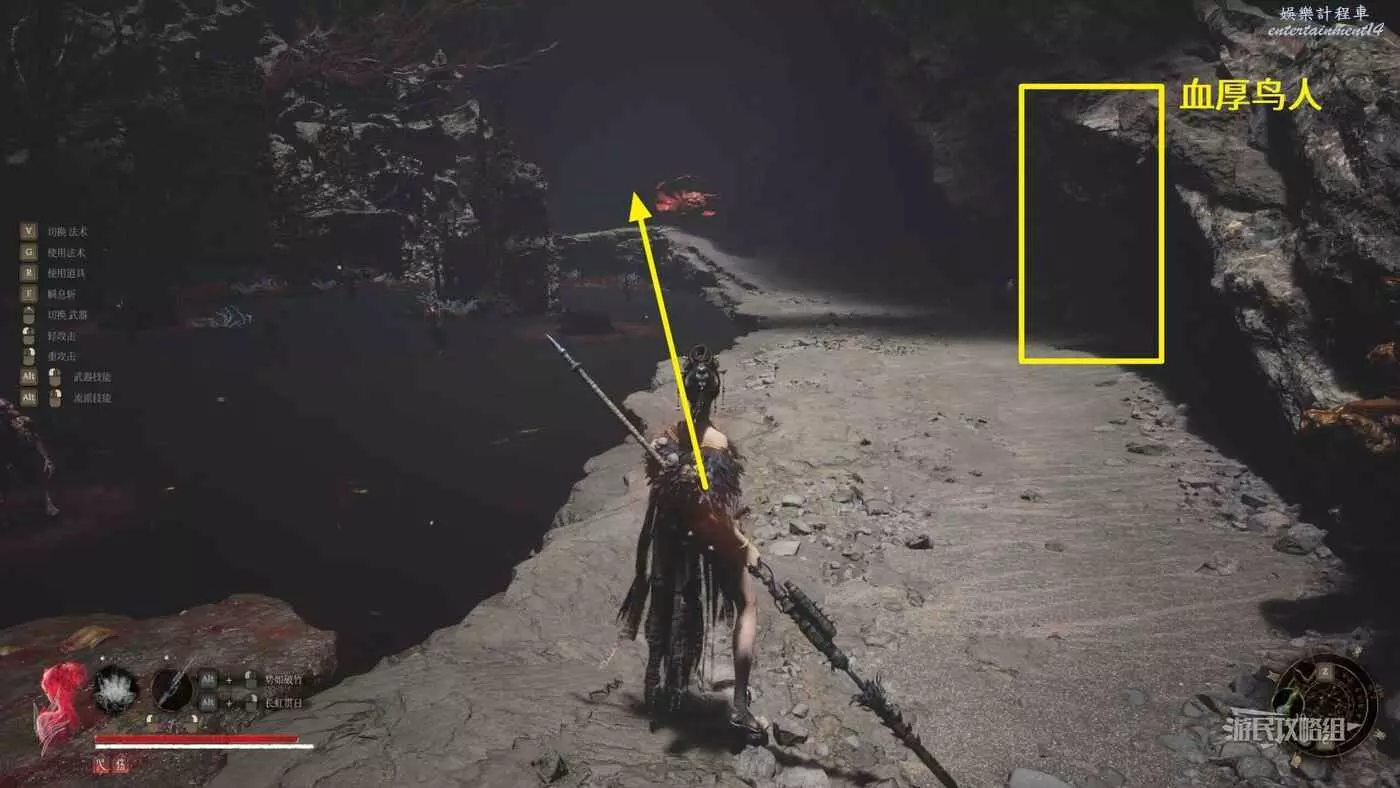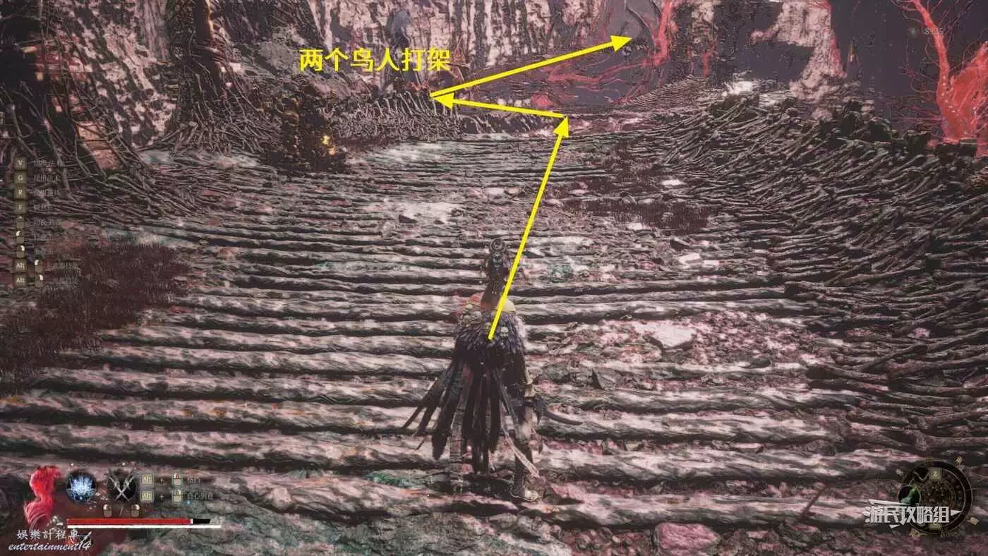 到達對岸之後,繼續往前方紅色大花的方向走,注意途中一個凹槽裡有一個陰人的鳥人,血特別厚,裡面就一個普通拾取物,不想拾取的話可以直接繞過它。