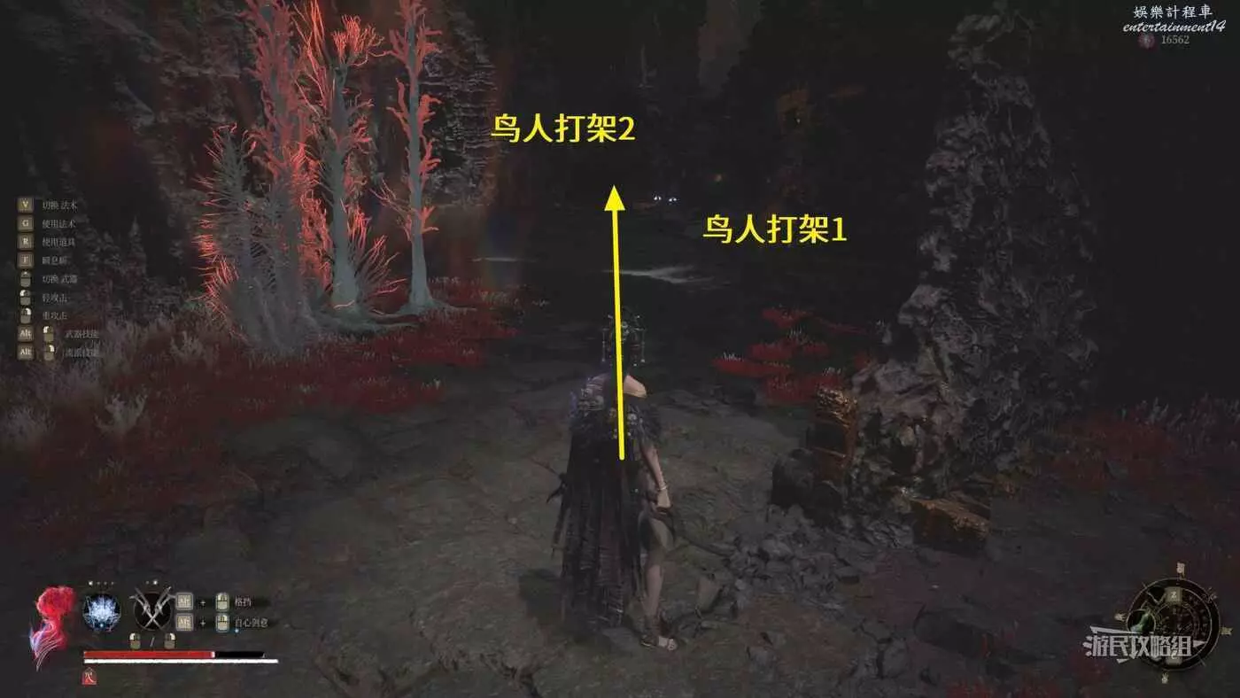 前方這條路上有兩組鳥人打架,第一組打得比較快,而且贏的那個血很厚,建議直接繞過,第二組打的很慢,兩組血都很厚,離遠點直接繞過就行,小心被誤傷。
