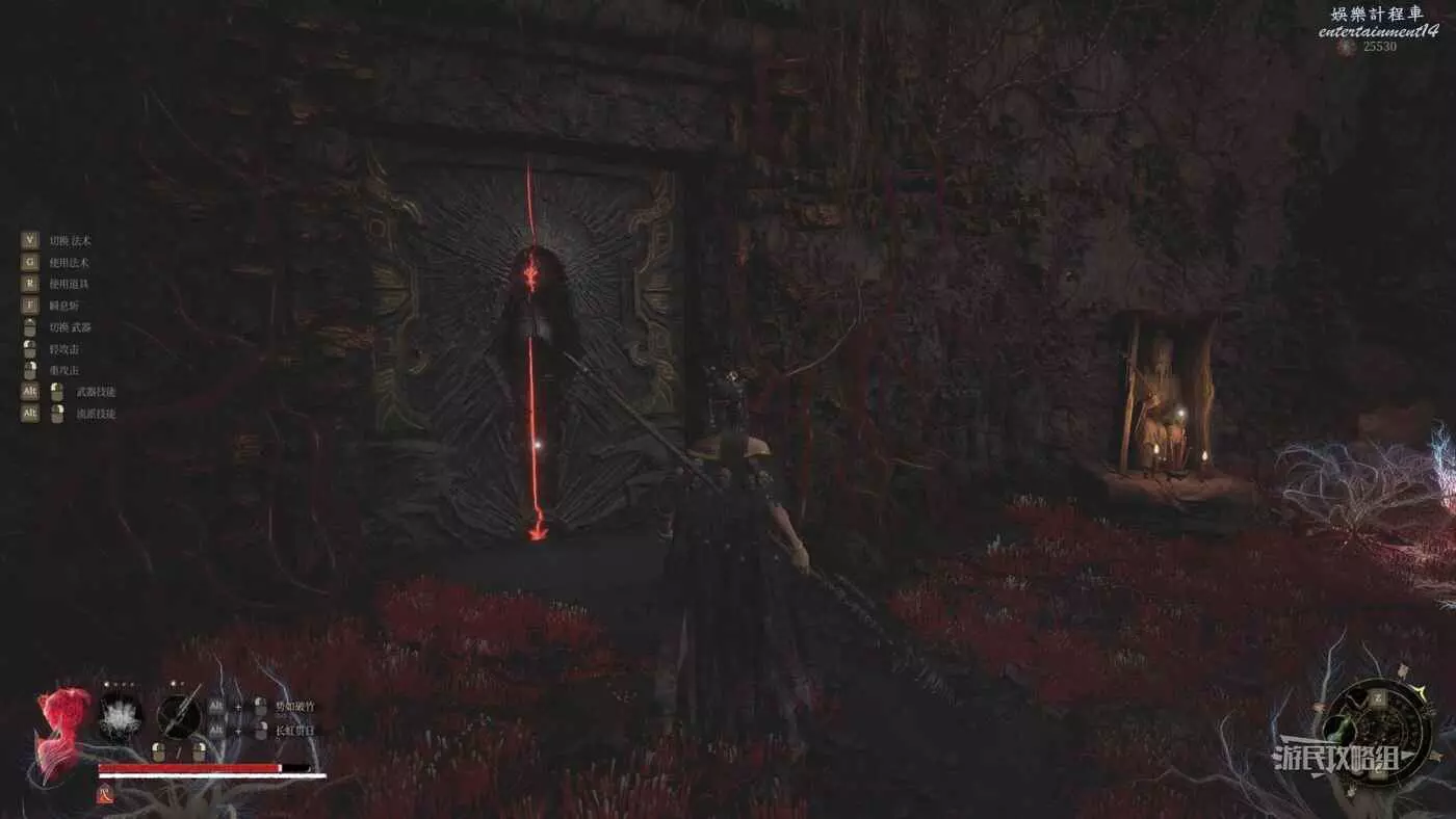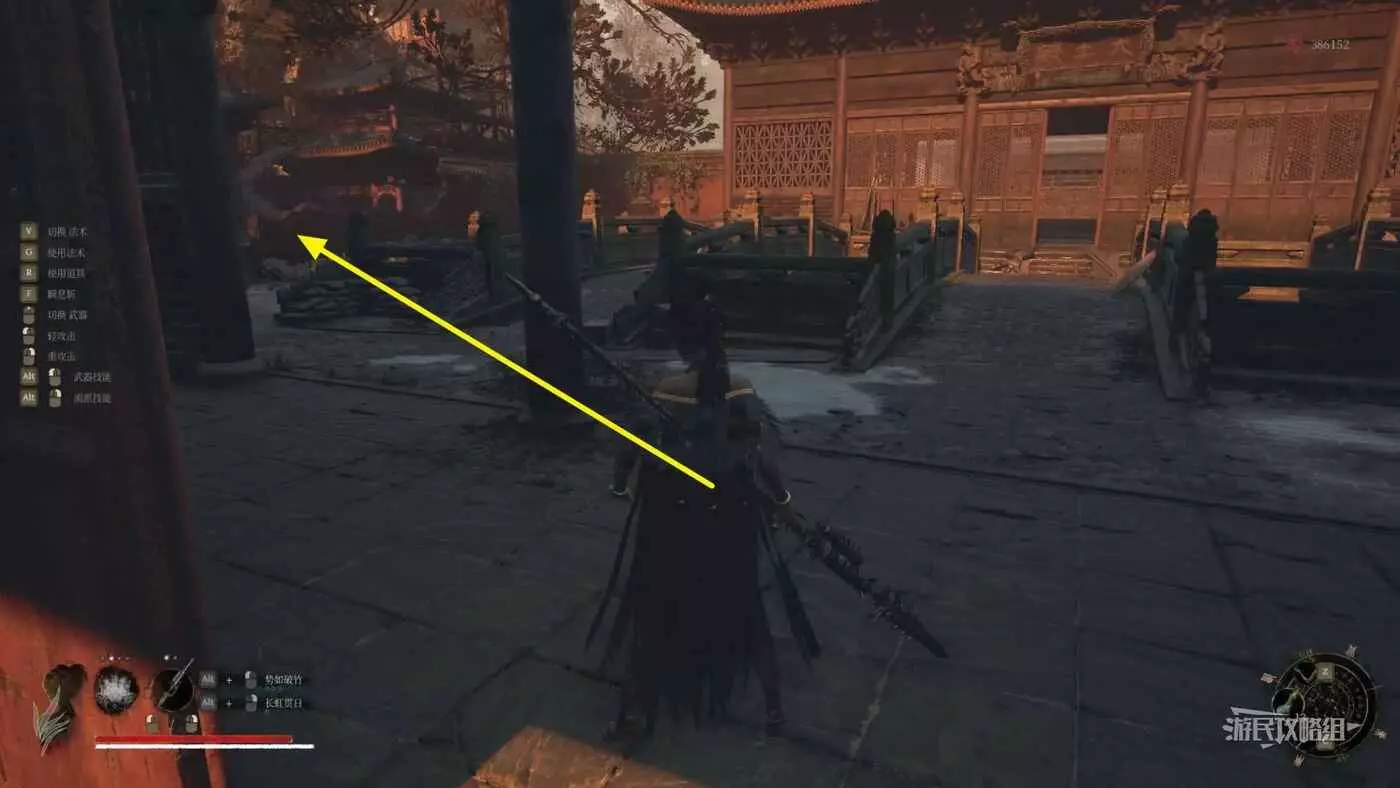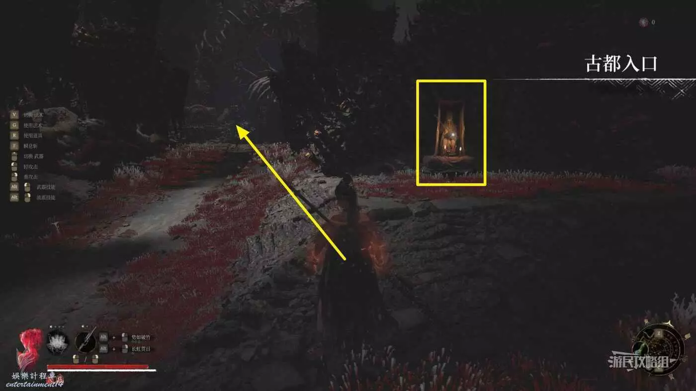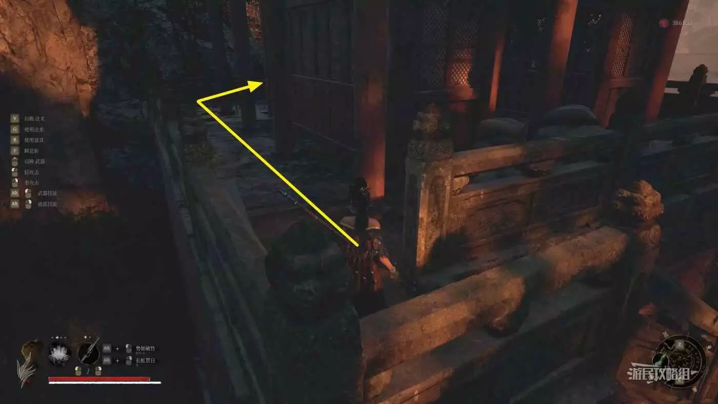 穿過第一道門後,往左看,左邊紅牆有個缺口,從缺口進入側面區域。