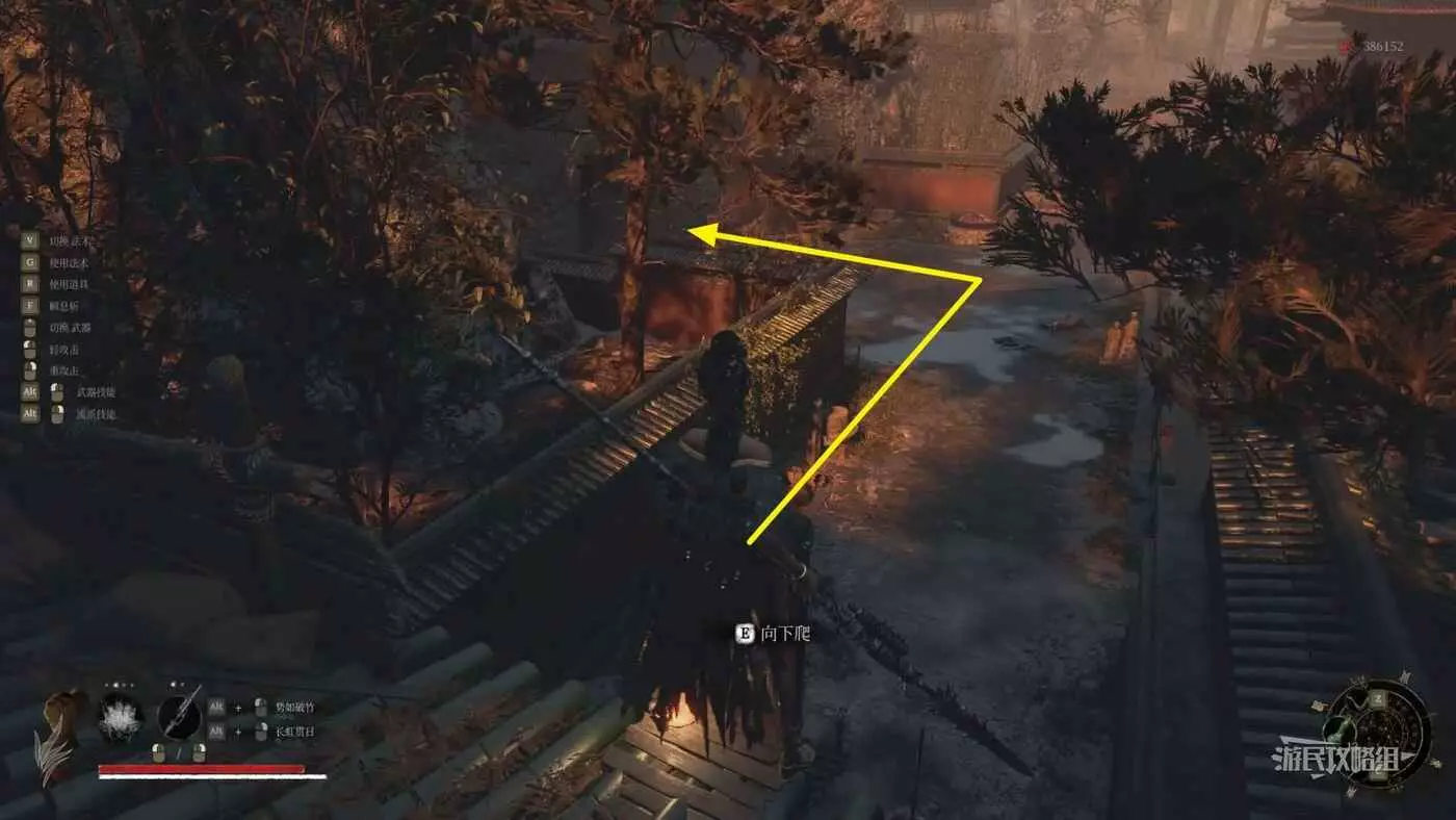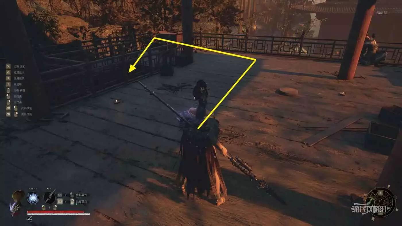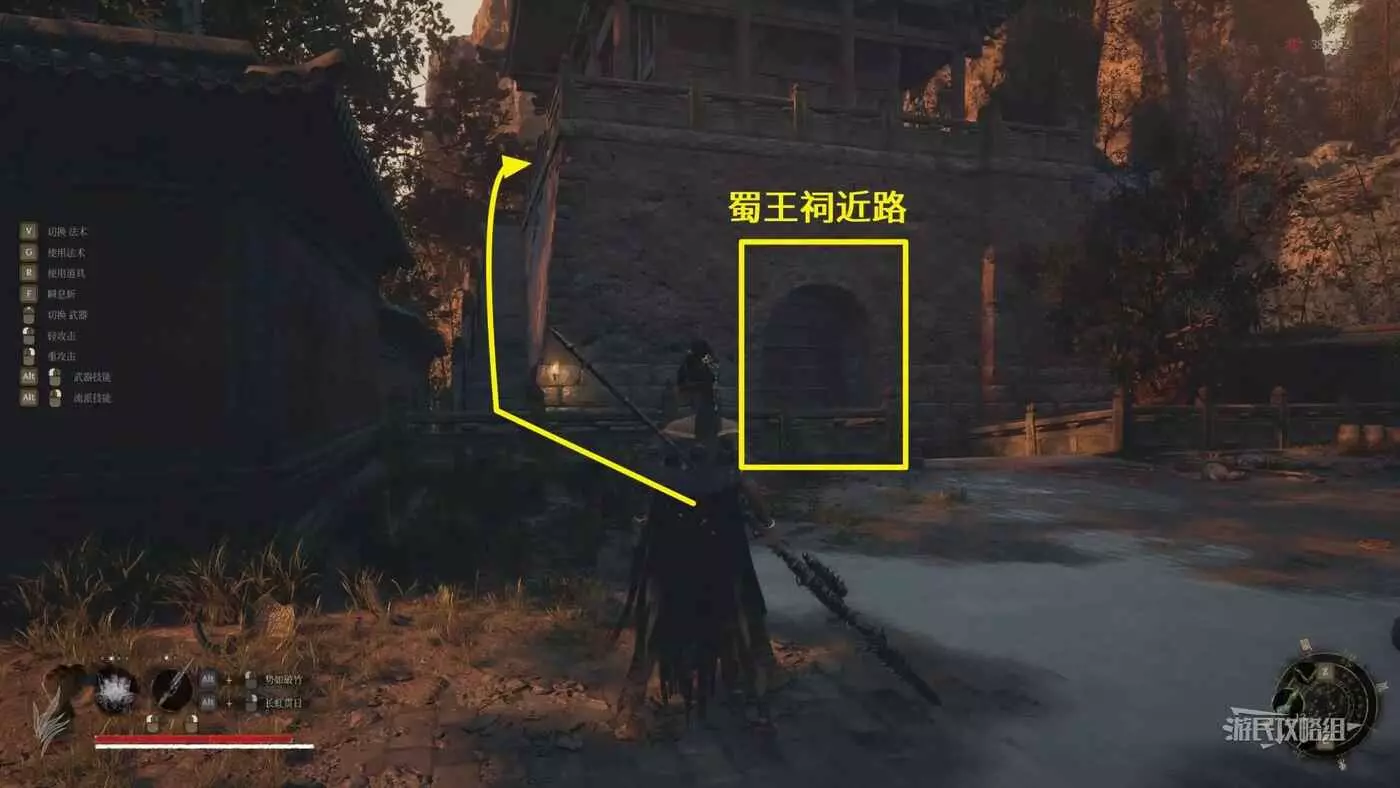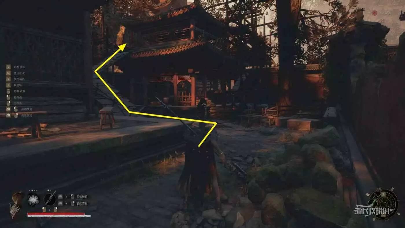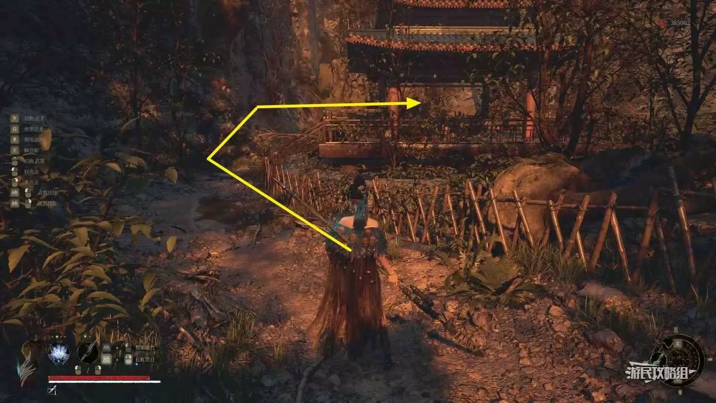 穿過第一道門後,往左看,左邊紅牆有個缺口,從缺口進入側面區域。