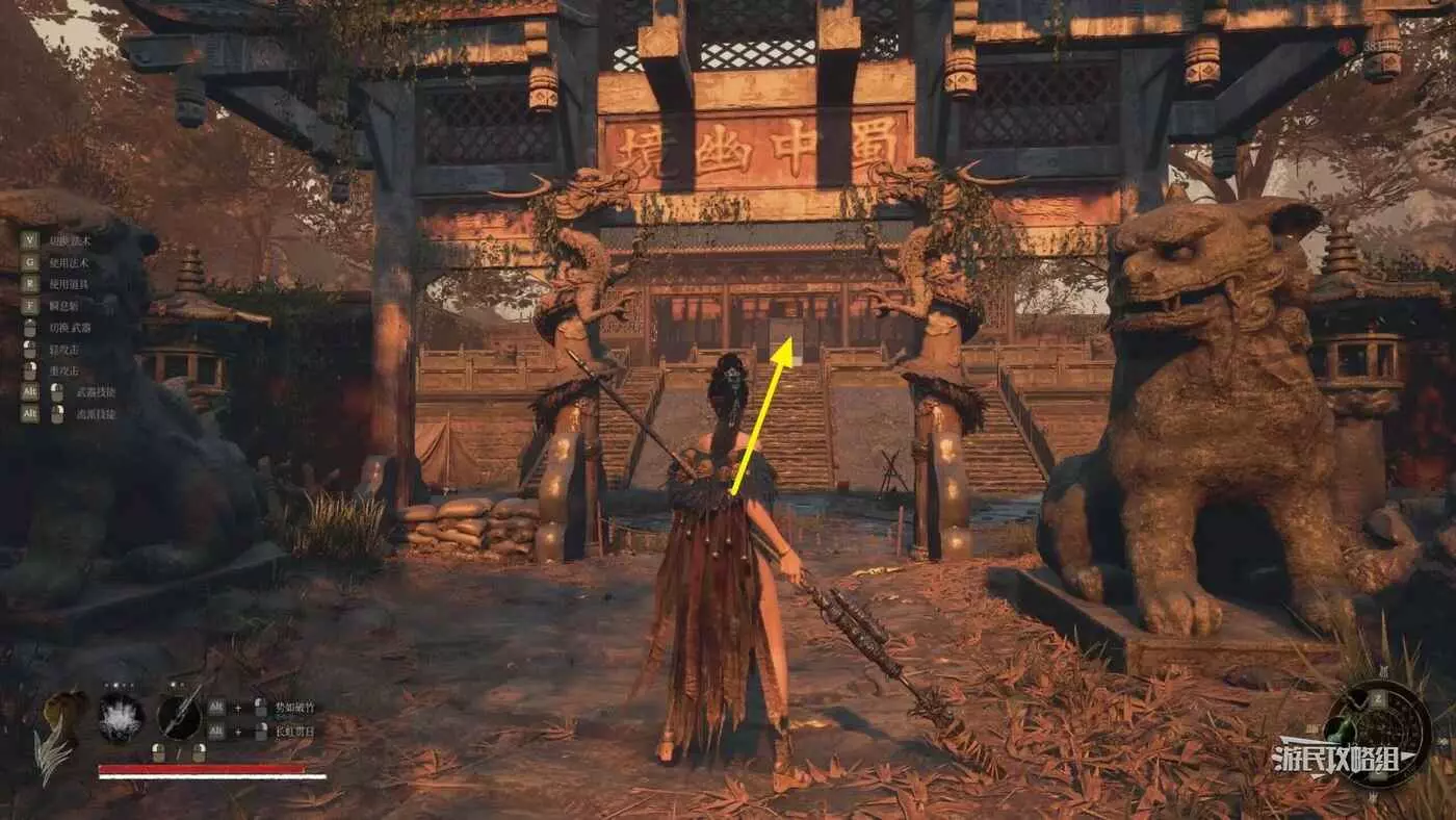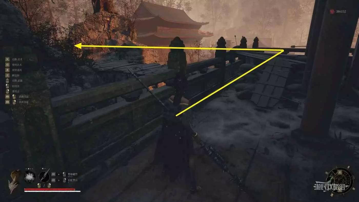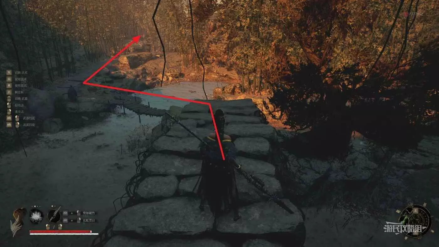 打完BOSS“重生妖樹”縛魂木後從【佛源鎮-棄世坑】神龕沿著新解鎖的路一路到達行宮區域(中間沒有岔路),在剛進入行宮時,左側有一座木橋,穿過木橋就能到達行宮正門。
