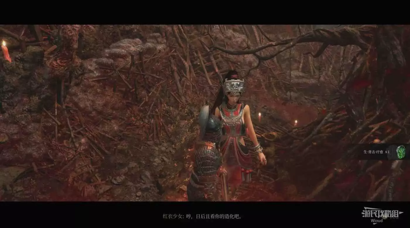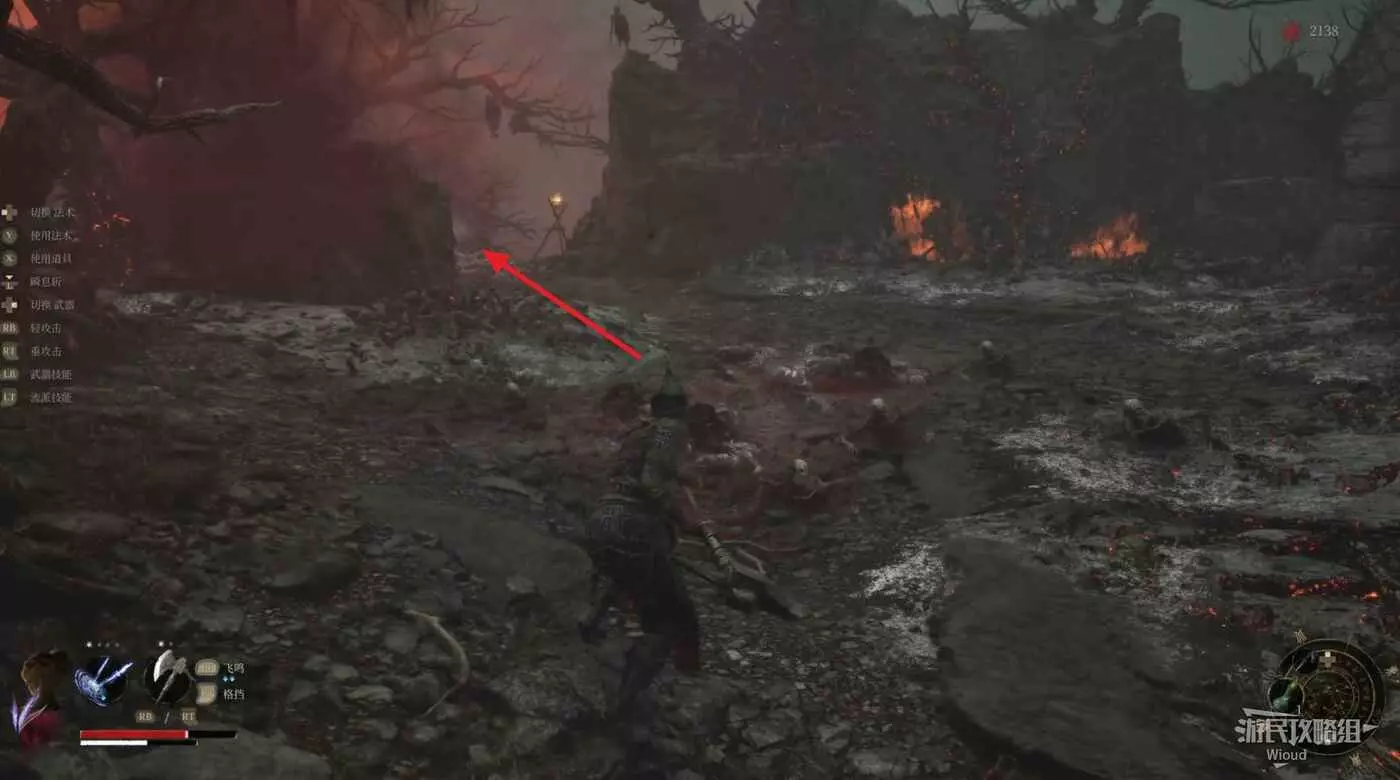 路口直接右拐,沿路走到頭,遇到一個馬匹怪物,將其幹掉後,左側懸崖紫色發光點可撿到一個黯淡紅羽。