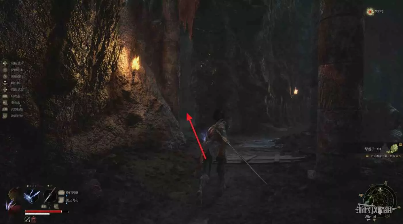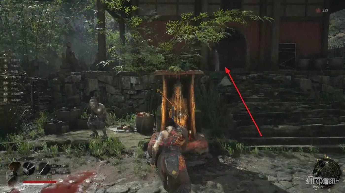 從第一個地圖【佛源鎮】第三個篝火【含光禪院】出發,面對神龕穿過前方拱門進入一個院子。