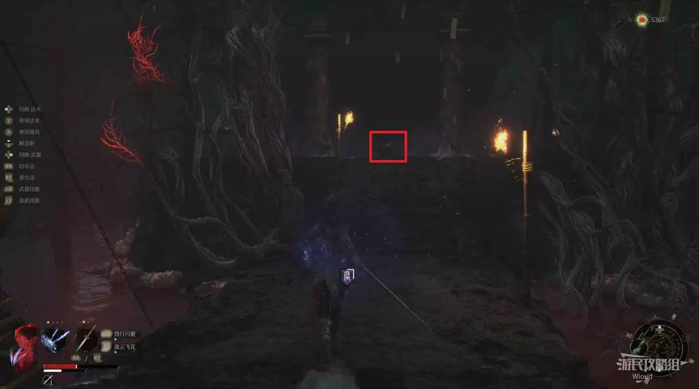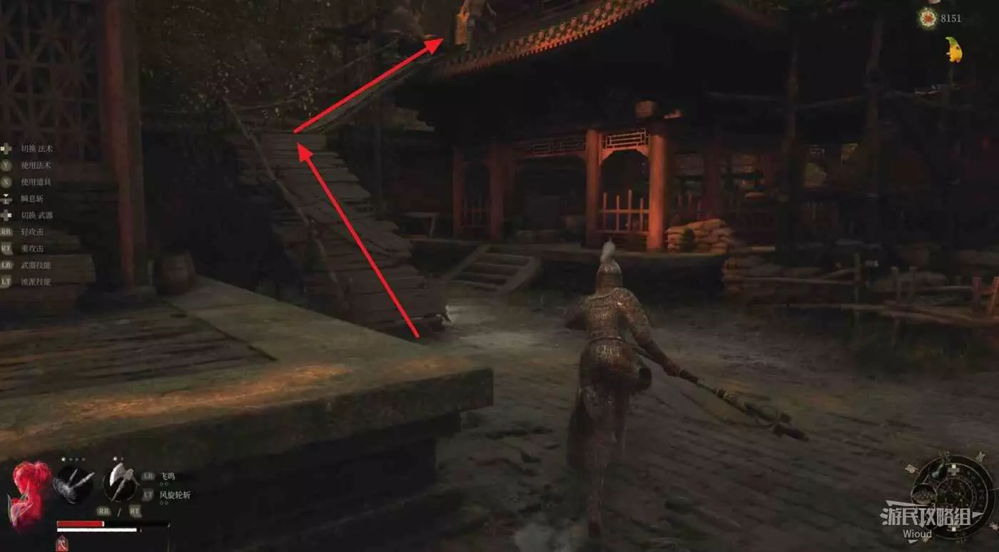 直走爬前方梯子過去,往右前方紅框所示的建築位置走,進入此建築觸發【唐王宮女】的BOSS戰,將其擊敗後獲得一個黯淡紅羽。