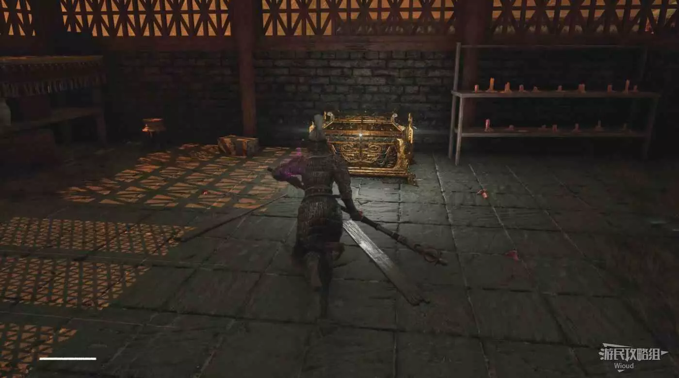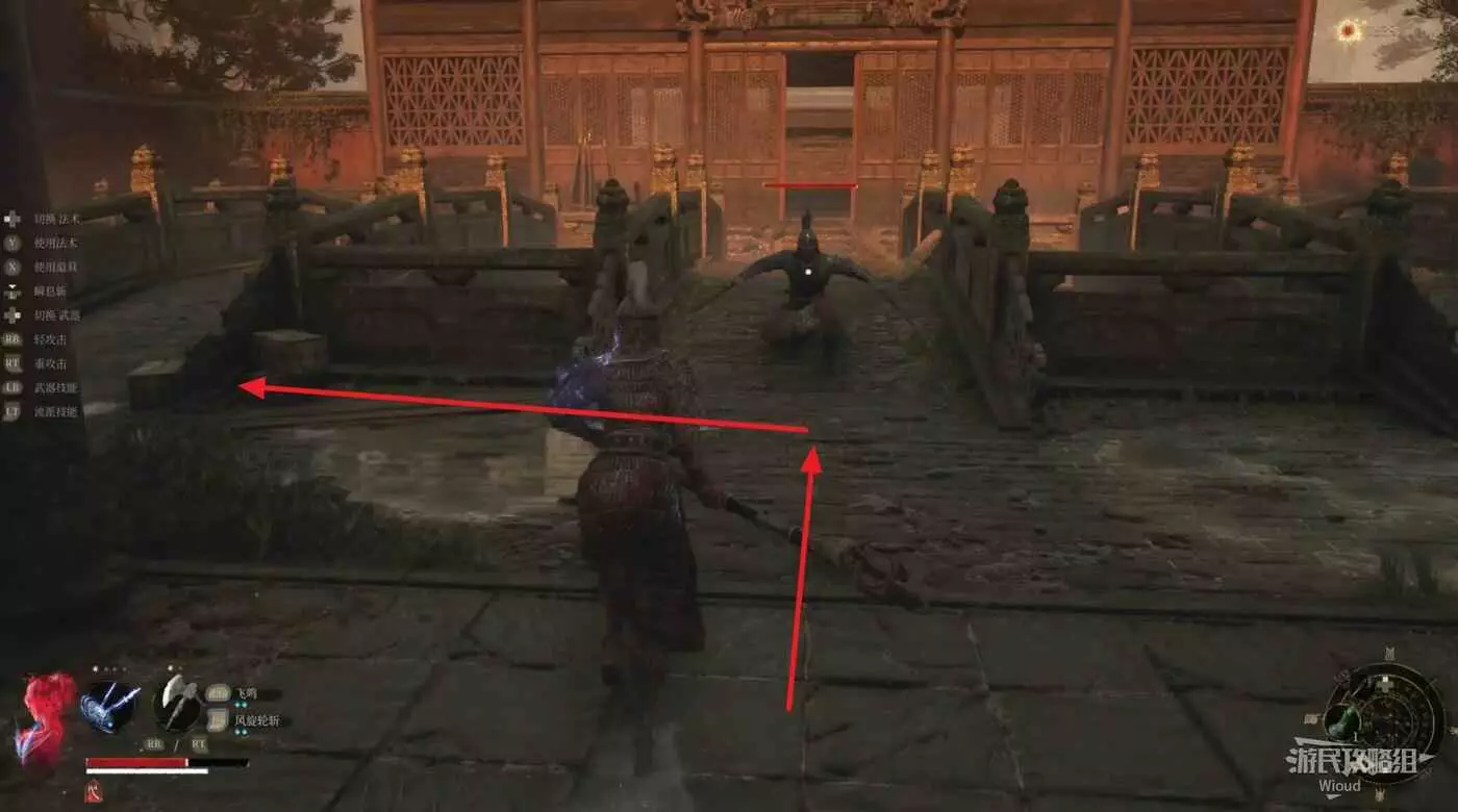 穿過第一個房間,院子處遇到一個雙刀明軍,戰鬥結束往左走,穿過一個缺口。