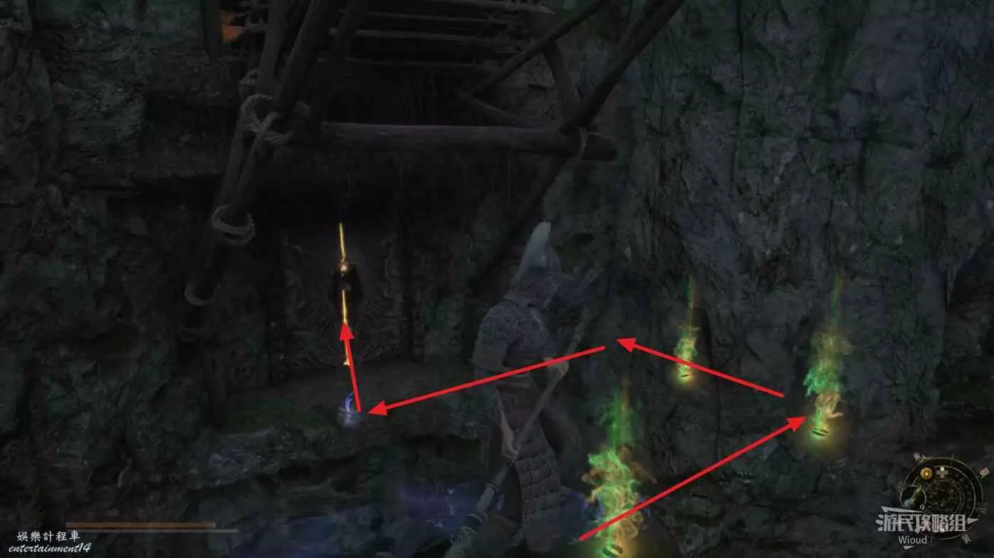 隱藏橋上面對機關門,沿著下圖路線移動到機關門前,提前換上失心抗性較高的裝備。