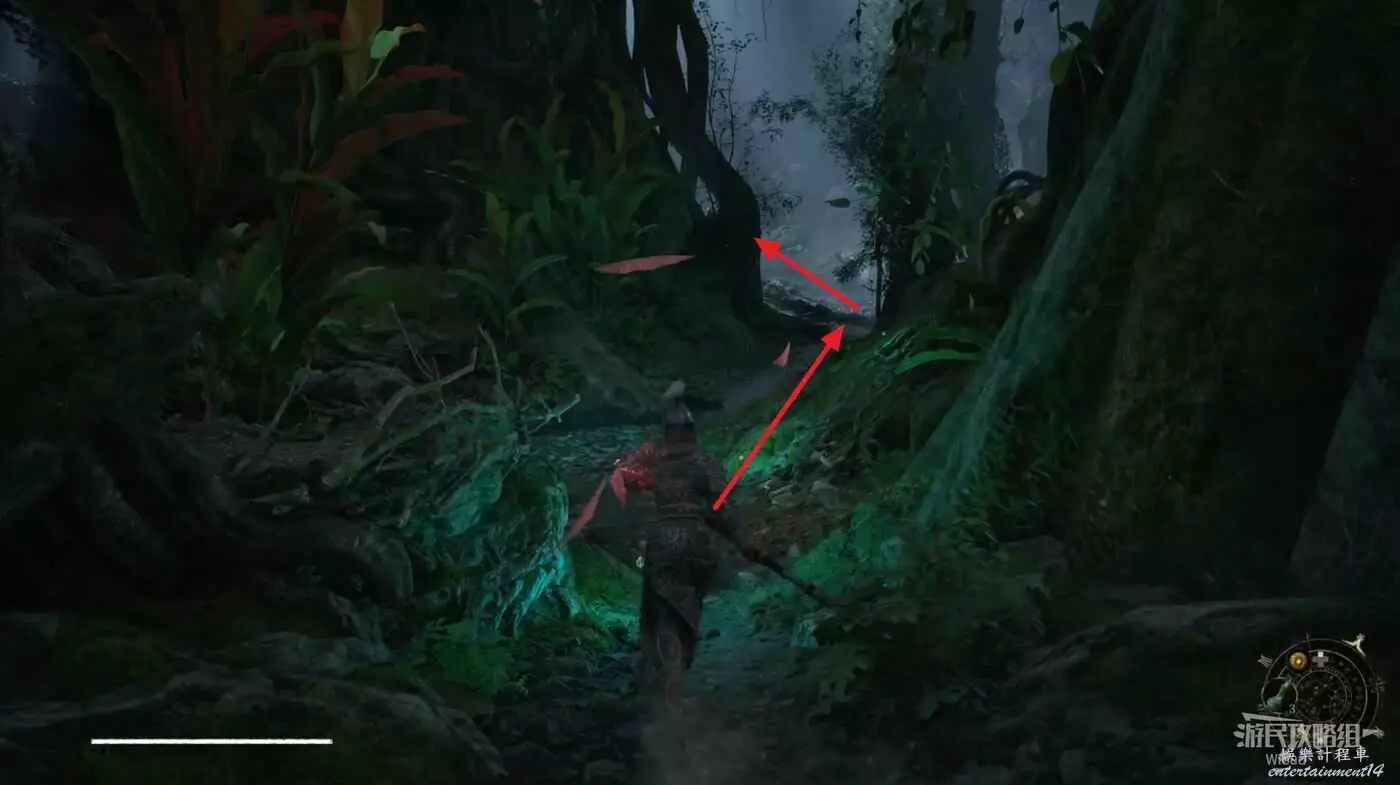 中間沒有任何岔路,全程往前走,節點時穿過一段藤蔓橋後,在往前走不遠右側可以看到一個紫色閃光點。