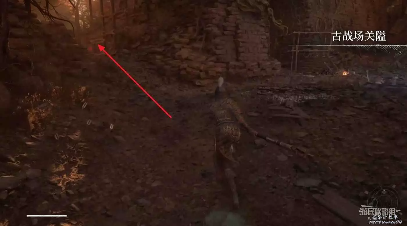 穿過牆壁缺口先直走到對面建築樓梯處再左拐,穿過一個燒火大鍋進入左側建築。