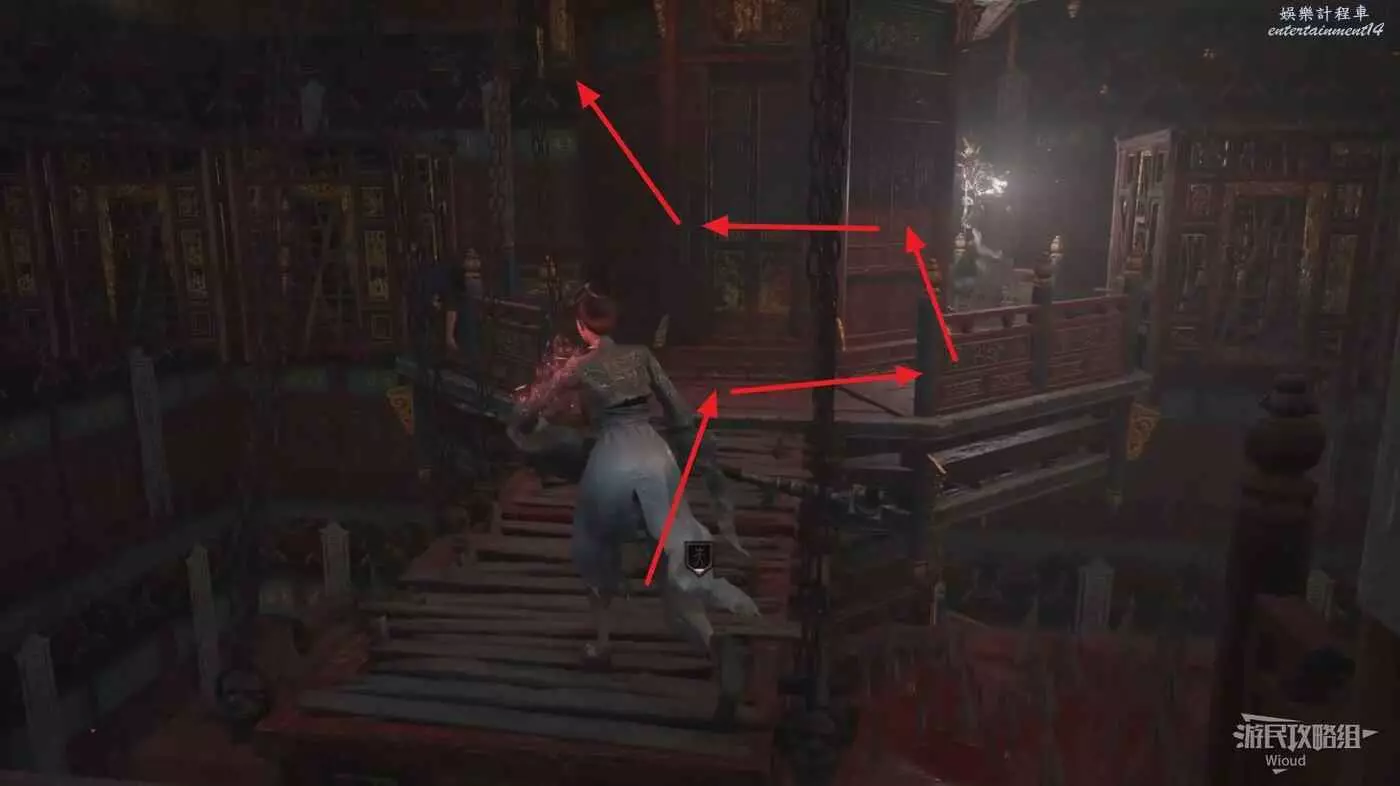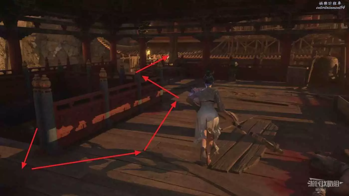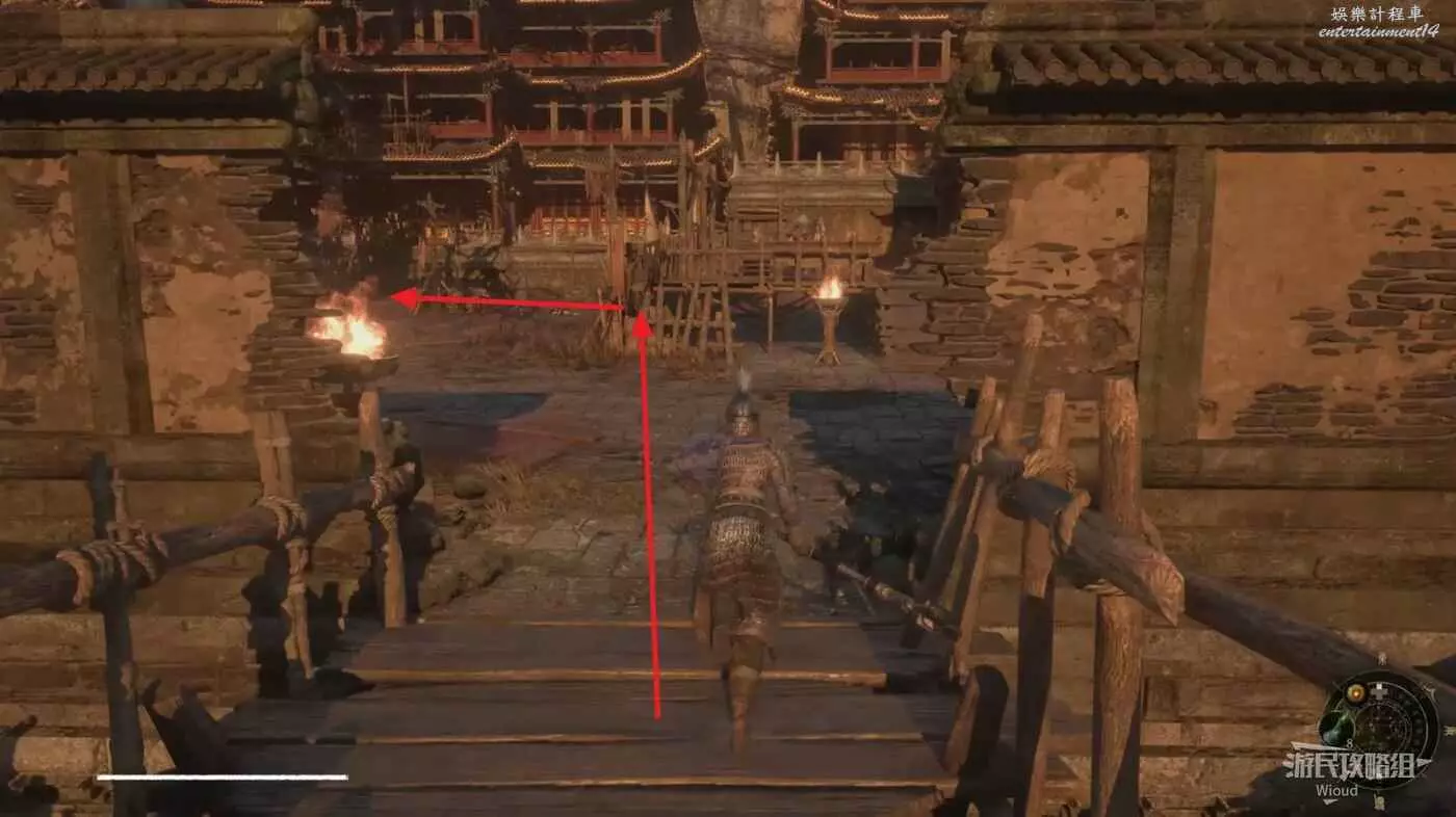 建築內往右走,爬院子裡的樓梯上去,然後在建築裡沿著樓梯往下走一層,沿著房間左邊走一圈能找到一個連結另一棟建築的木橋,直接走到對面建築沿著樓梯往上走一層。