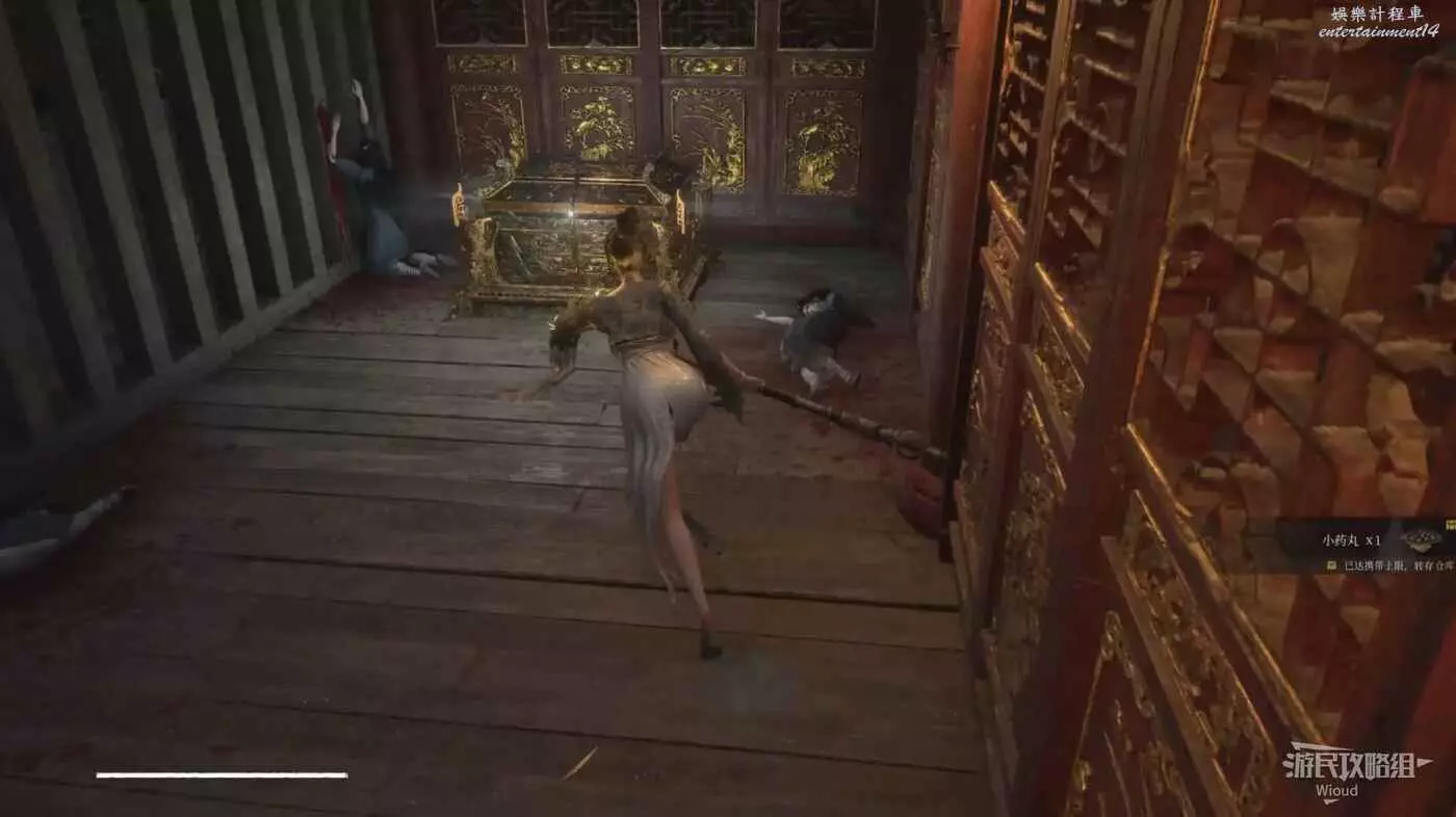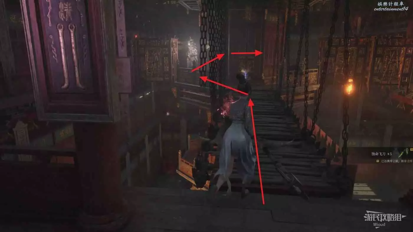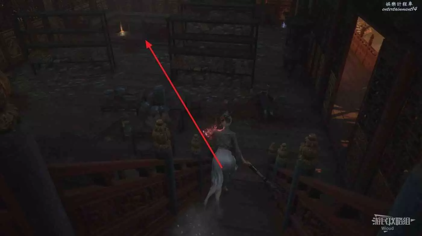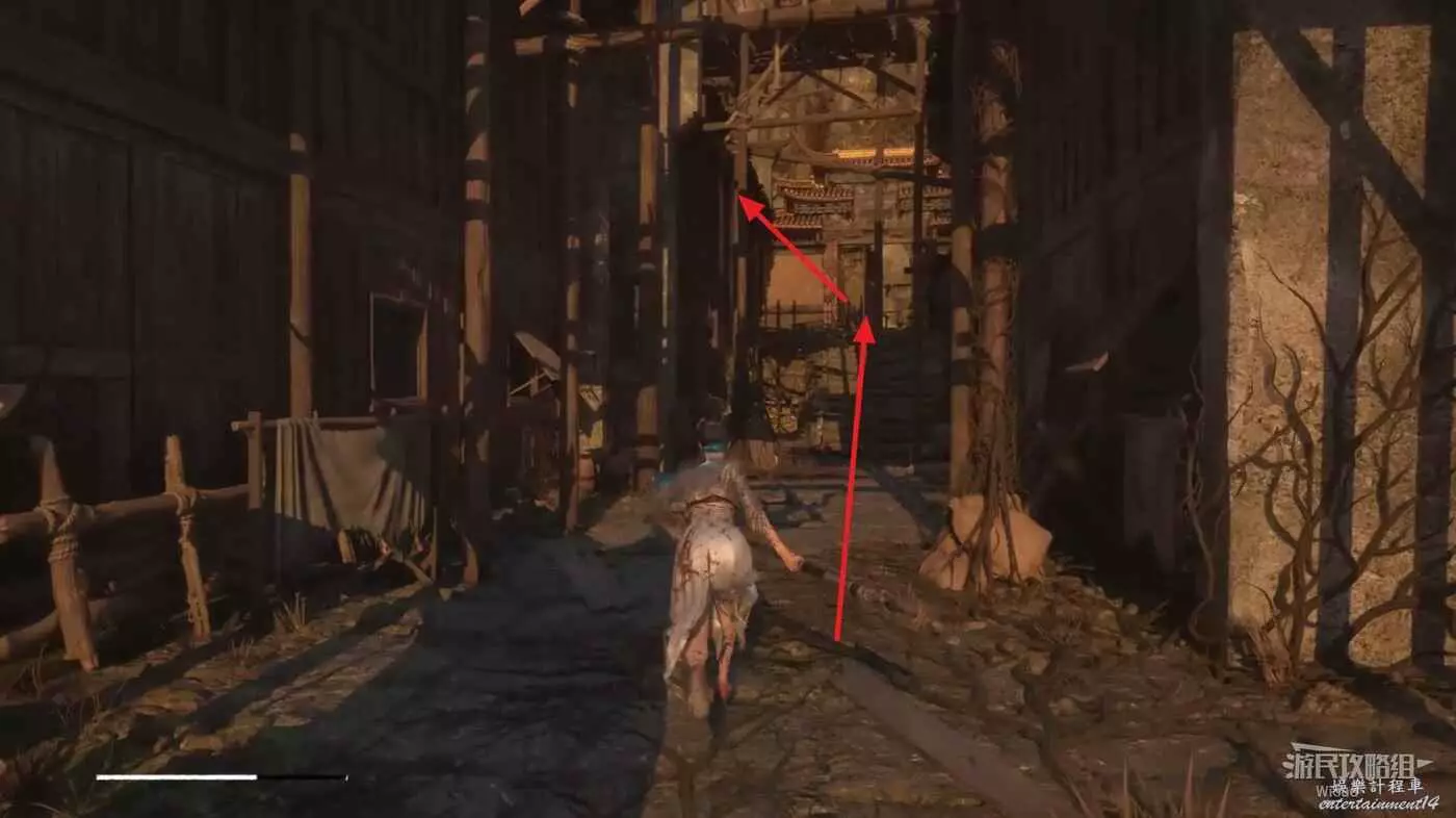 建築內往右走,爬院子裡的樓梯上去,然後在建築裡沿著樓梯往下走一層,沿著房間左邊走一圈能找到一個連結另一棟建築的木橋,直接走到對面建築沿著樓梯往上走一層。
