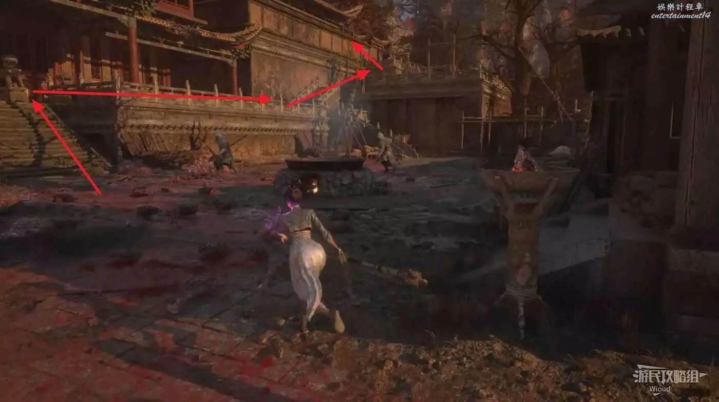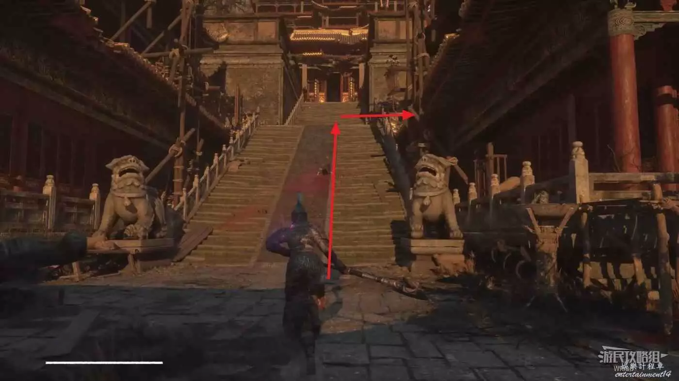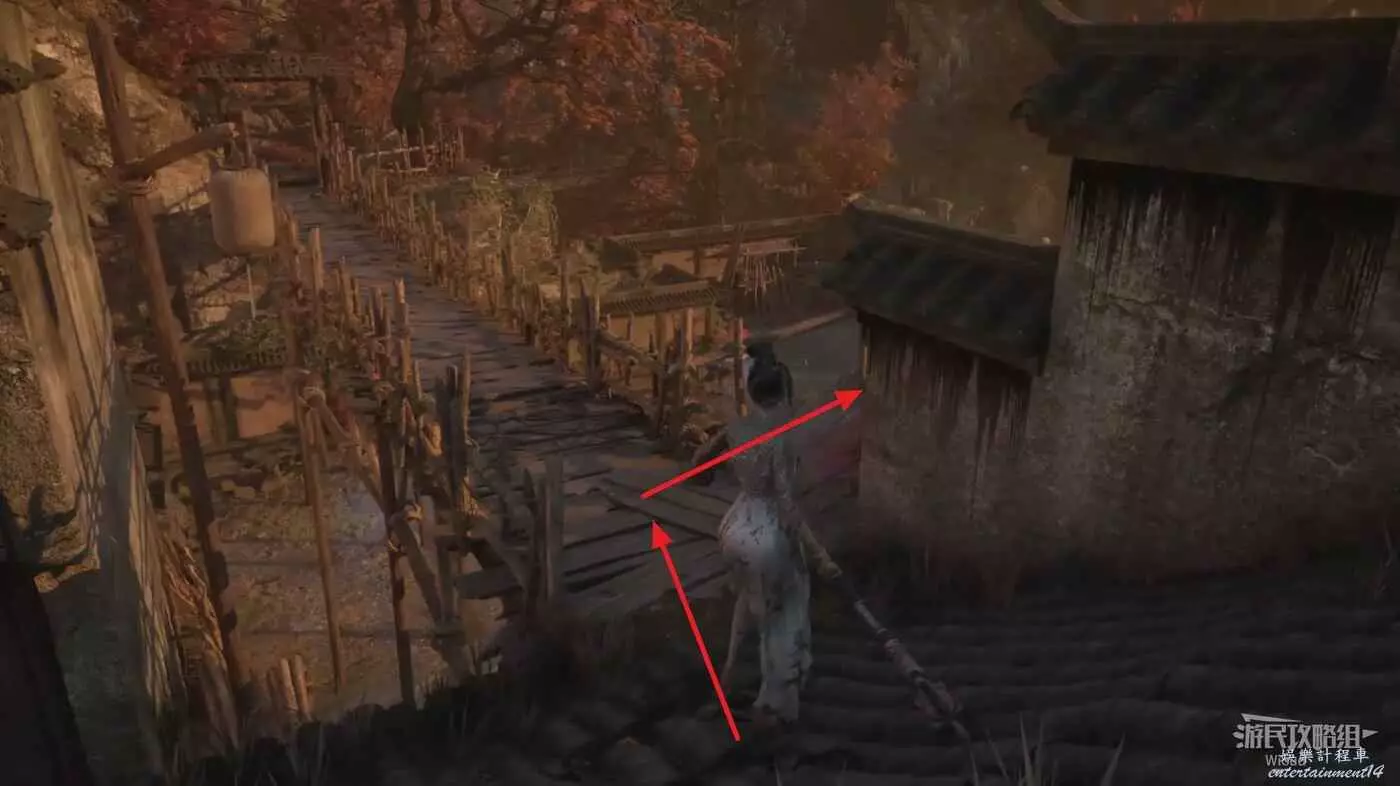 戰鬥結束後回到BOSS房入口,直走穿過前方亭門,走左側斜坡上去沿路走。