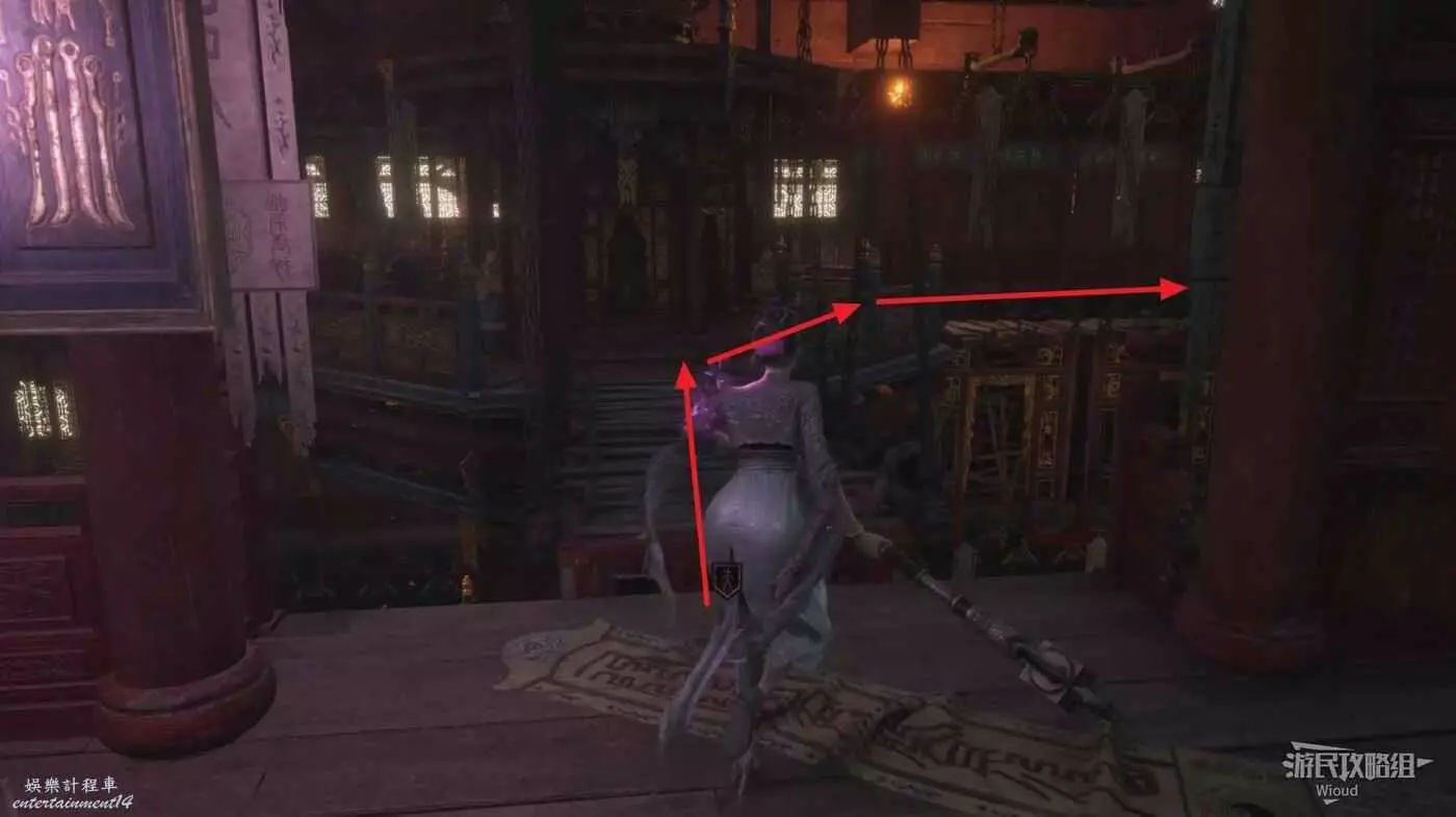 從神龕恢復狀態,靈宮殿後門出來往右走,爬左側樓梯沿著下圖路線開啟盡頭左側的門,開啟與劉文秀的BOSS戰。