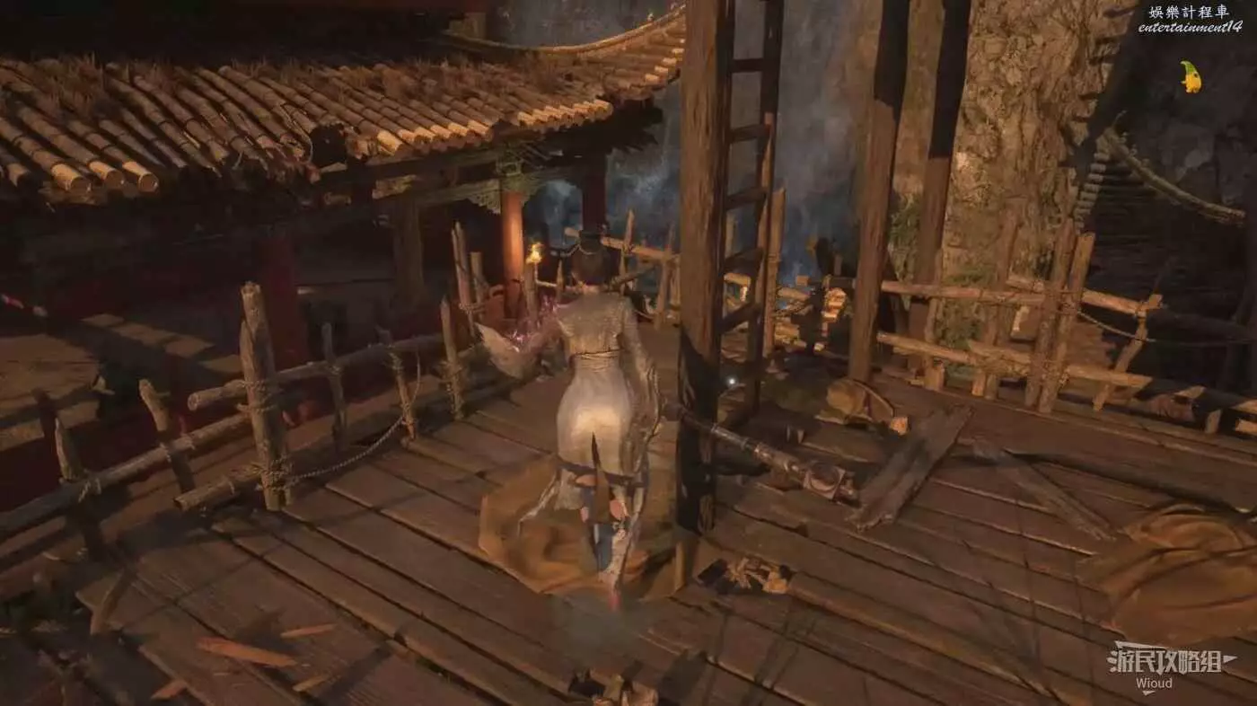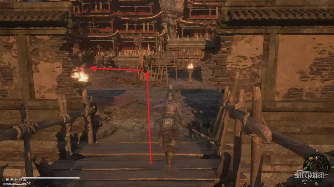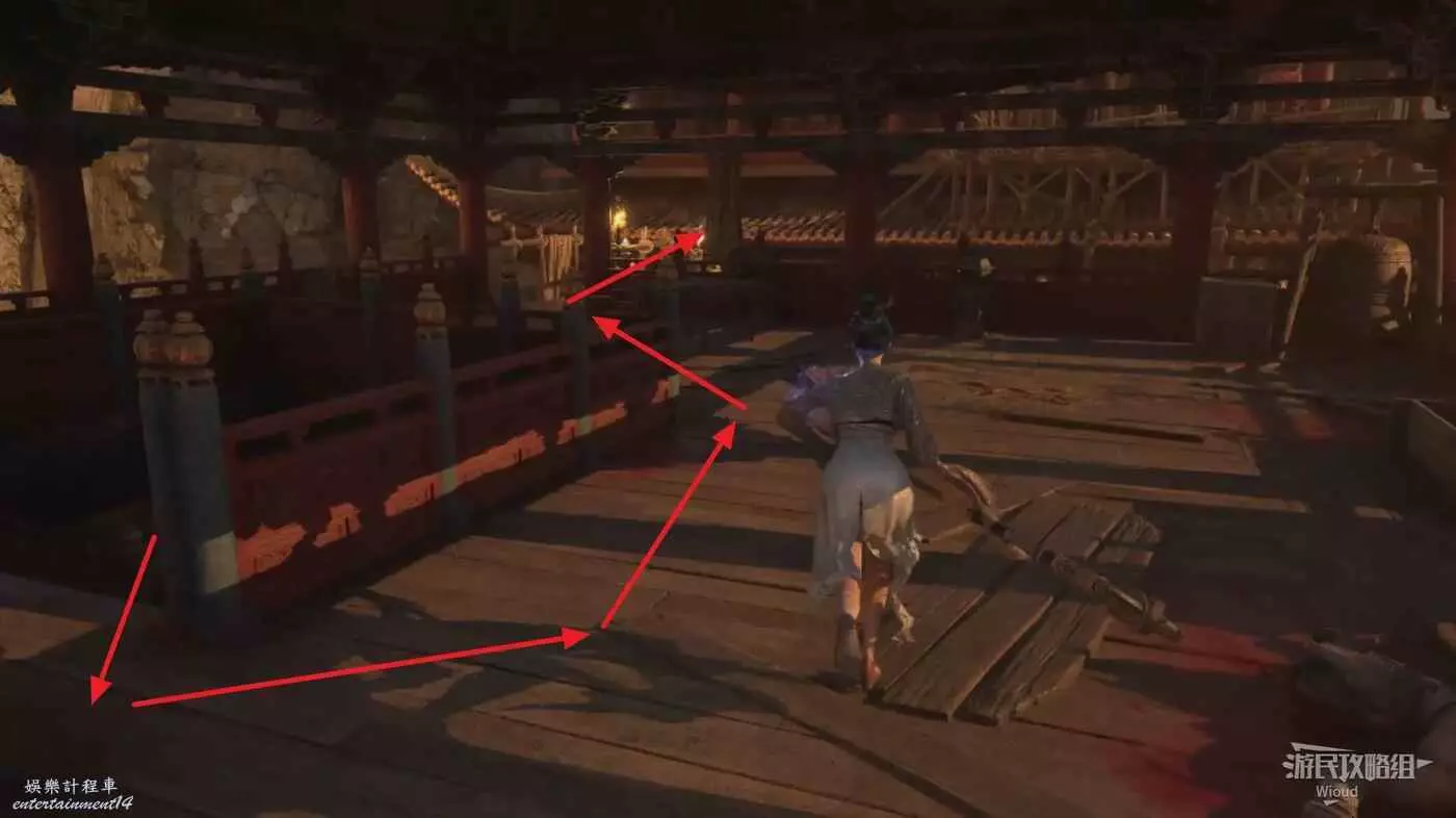 建築內往右走,爬院子裡的樓梯上去,然後在建築裡沿著樓梯往下走一層,沿著房間左邊走一圈能找到一個連結另一棟建築的木橋,直接走到對面建築沿著樓梯往上走一層。