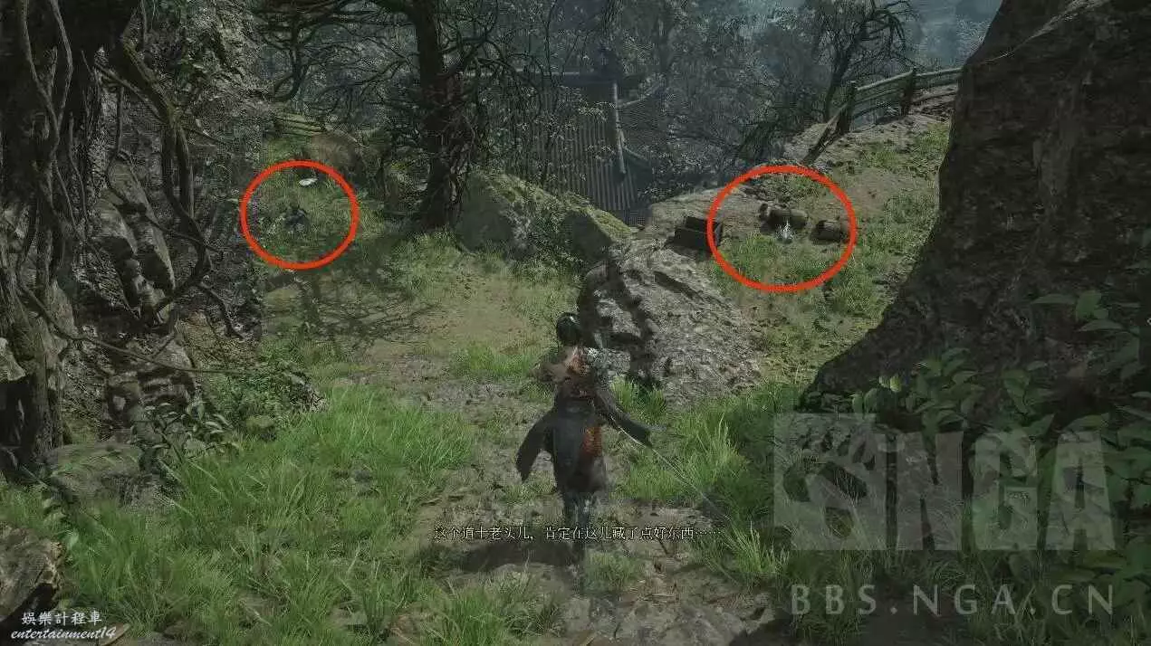 出洞窟後先去右側拿右側飛刀*3,左側兩個小怪在討論每天道士老頭都跑上來估計藏了好東西,擊殺掉小怪可以拾取到[蒸面兔*2][蒸面兔]使用後可以恢復些許生命值,前期[羽露瓶]使用次數非常寶貴,[蒸面兔]恢復生命也是不錯的選擇哦。