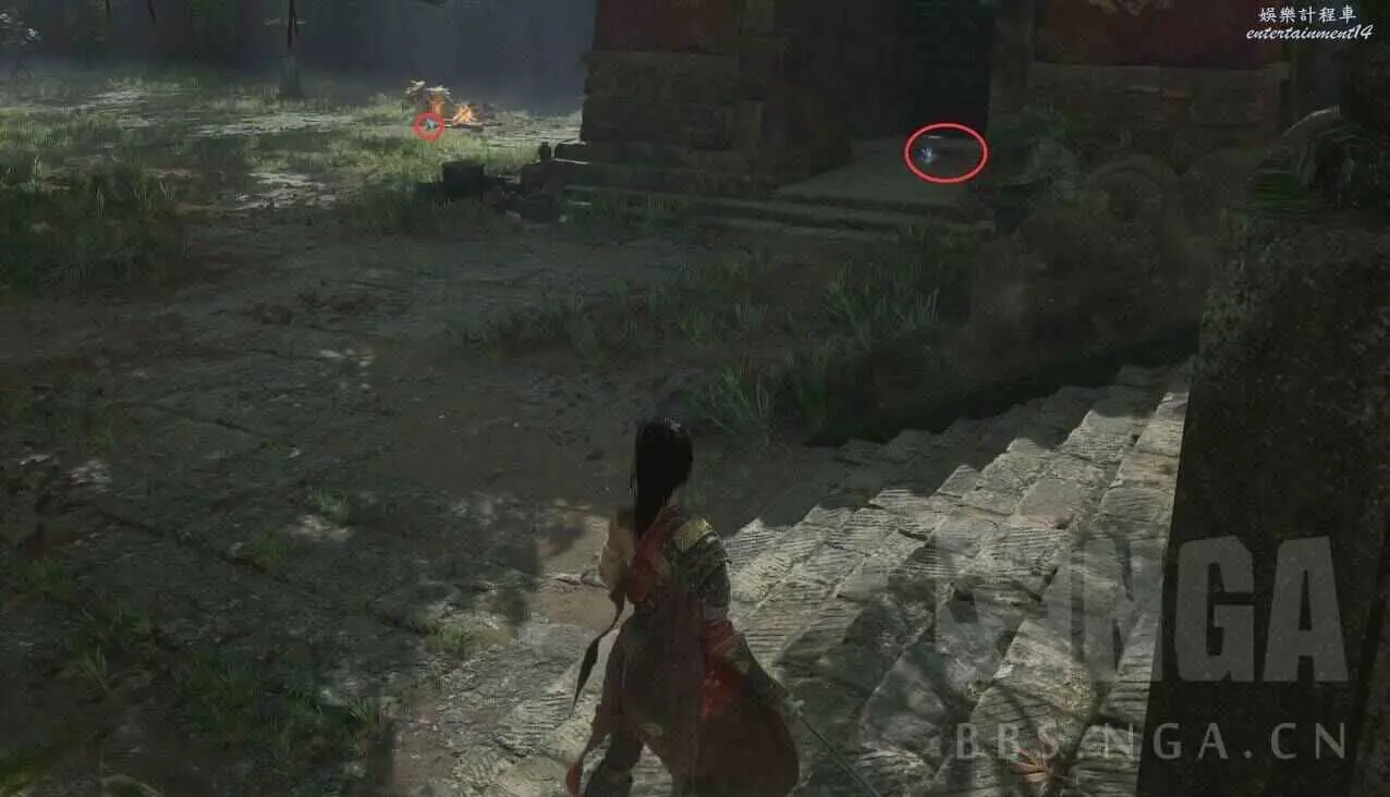 第一個神龕,也就是坐火點,就在出門右手。可以拜命一下探索普元寺大院,先別急著下樓梯,神龕處轉身,正後方有個小路進去有幾個帳篷可以和裡面的人對話獲得[秘制藥丸*2]。