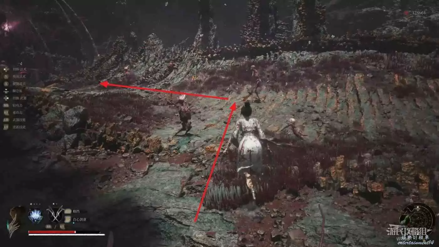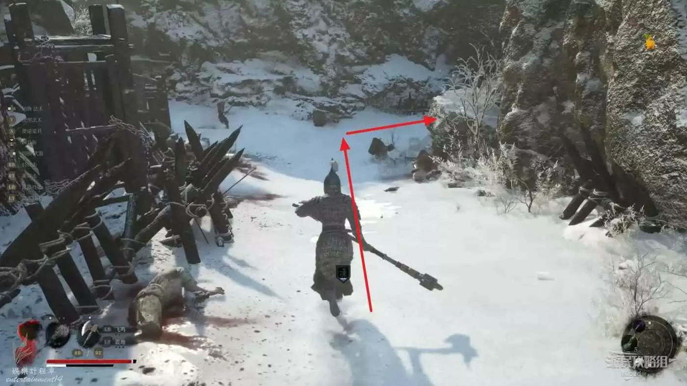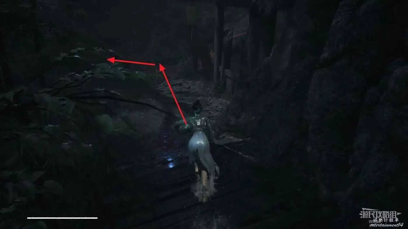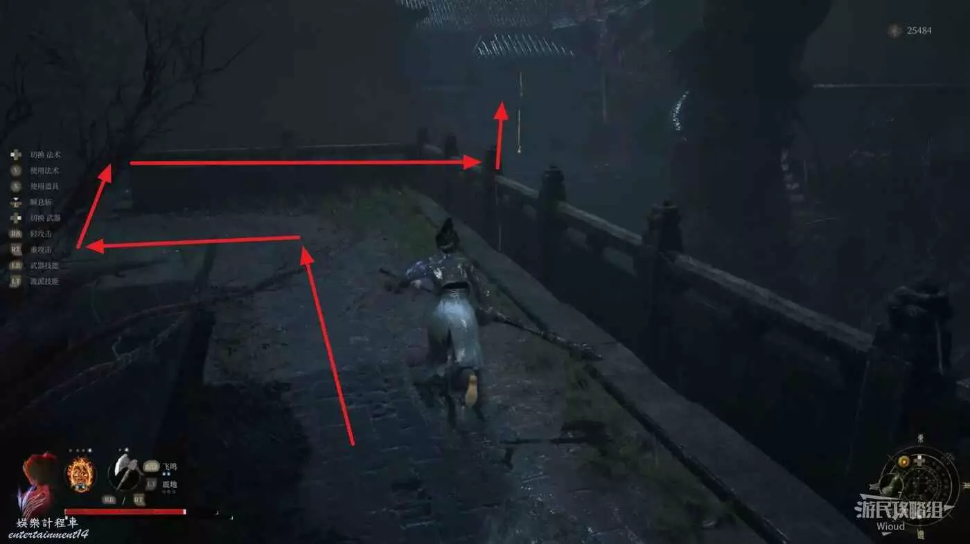 隱藏橋上面對機關門,沿著下圖路線移動到機關門前,提前換上失心抗性較高的裝備。