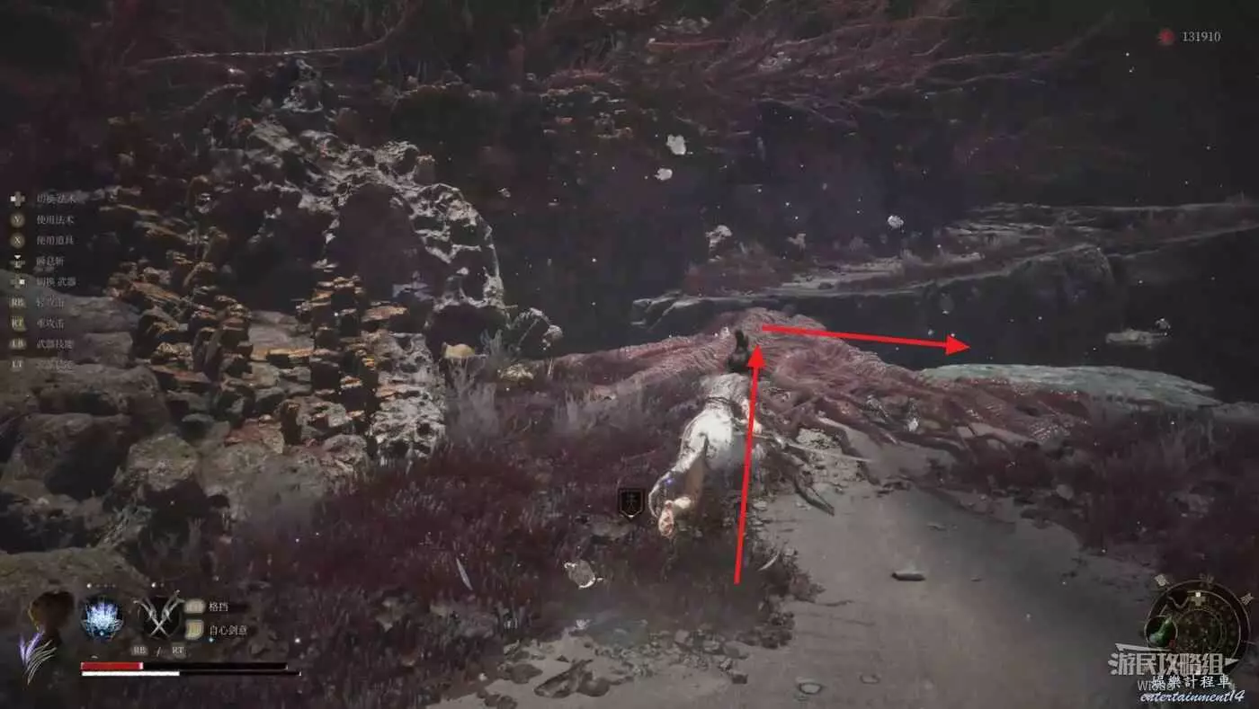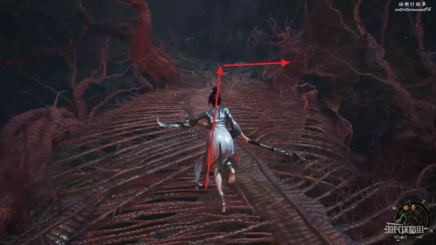 頂部先沿著左側斜坡上去再往右走,與機關互動,開啟通往之前區域的近路後,沿著下圖路線通過隱形橋然後往右走。