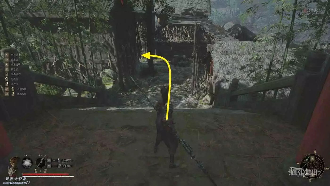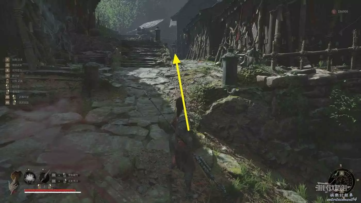 進門之後參考下圖,往中間樓梯右側的窄路走。