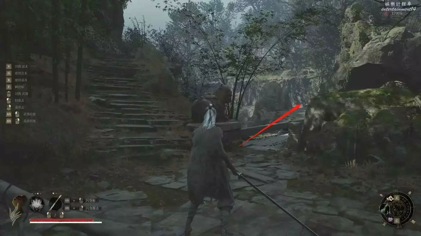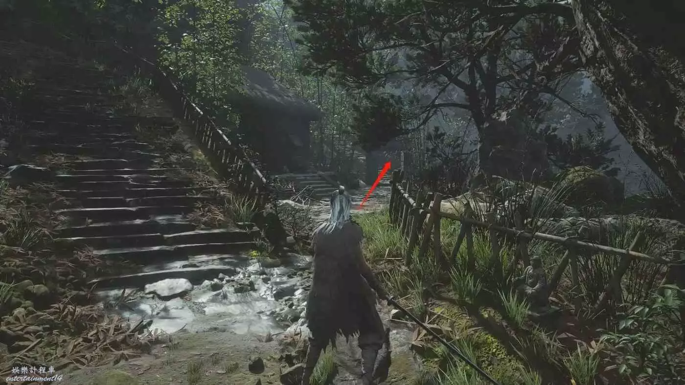 打完Boss吃人頭陀後,從含光禪院出發,過了獨木橋一直往右走,右邊是石橋。(左邊有山洞,竹子,熊貓商人)