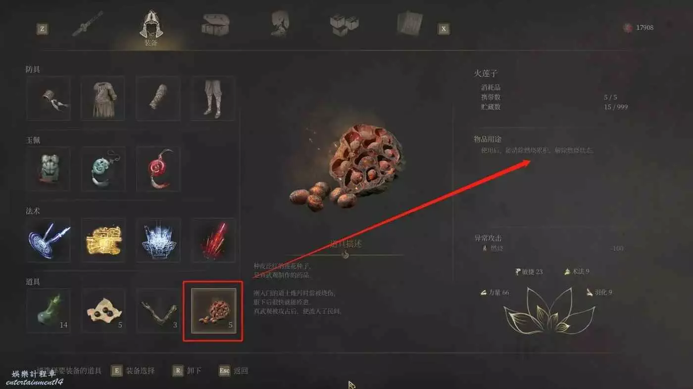 如果你有燃燒抗性比較高的防具的話,也可以全都穿上。同時把道具【火蓮子】裝備到快速道具欄上