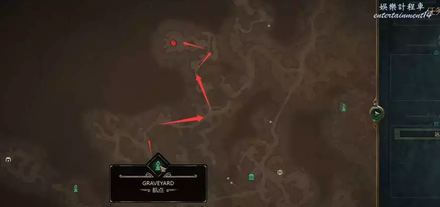 Boss位置位於graveyard傳送點正上方區域,若不熟悉路線,看下圖所示箭頭方向走。