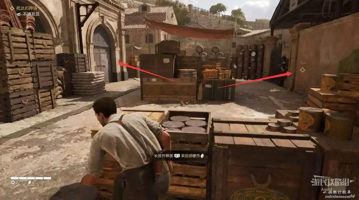 在里昂的幫助下,跟隨切薩雷到河道裡,翻牆潛入後,投擲硬幣引開倉庫門口的守衛然後勒暈。