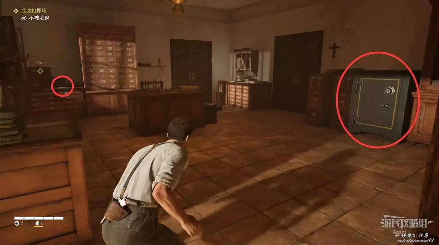 先去左邊辦公室裡有個保險箱,等下再回來進入右邊的倉庫。
